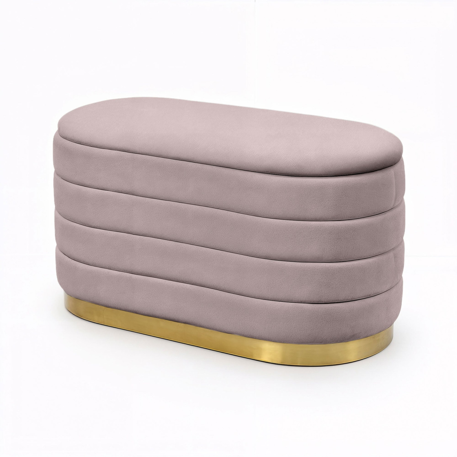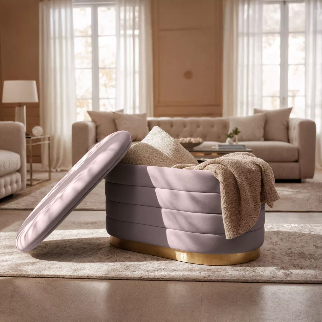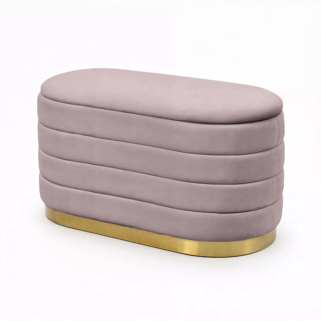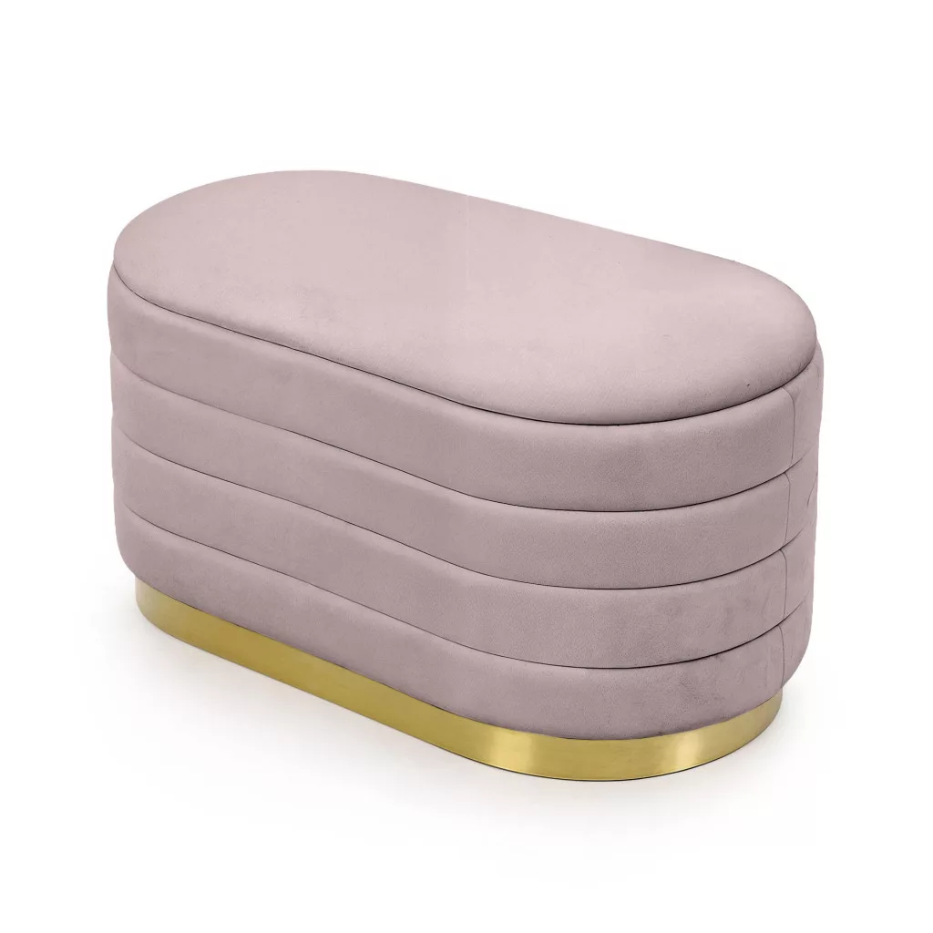 A BELLA tárolós puff a modern glamour stílus megtestesítője, amely lenyűgöző esztétikát párosít praktikus funkcionalitással. A puha, bársony kárpit gyönyörű púderrózsaszín árnyalata és a vízszintes steppelés kifinomult eleganciát kölcsönöz a búторnak, míg az ovális forma tökéletesen illeszkedik az organikus formák iránti legújabb trendekhez. A stabil MDF konstrukció és az arany színű fém talp nemcsak tartósságot, hanem egyedi karaktert is biztosít.