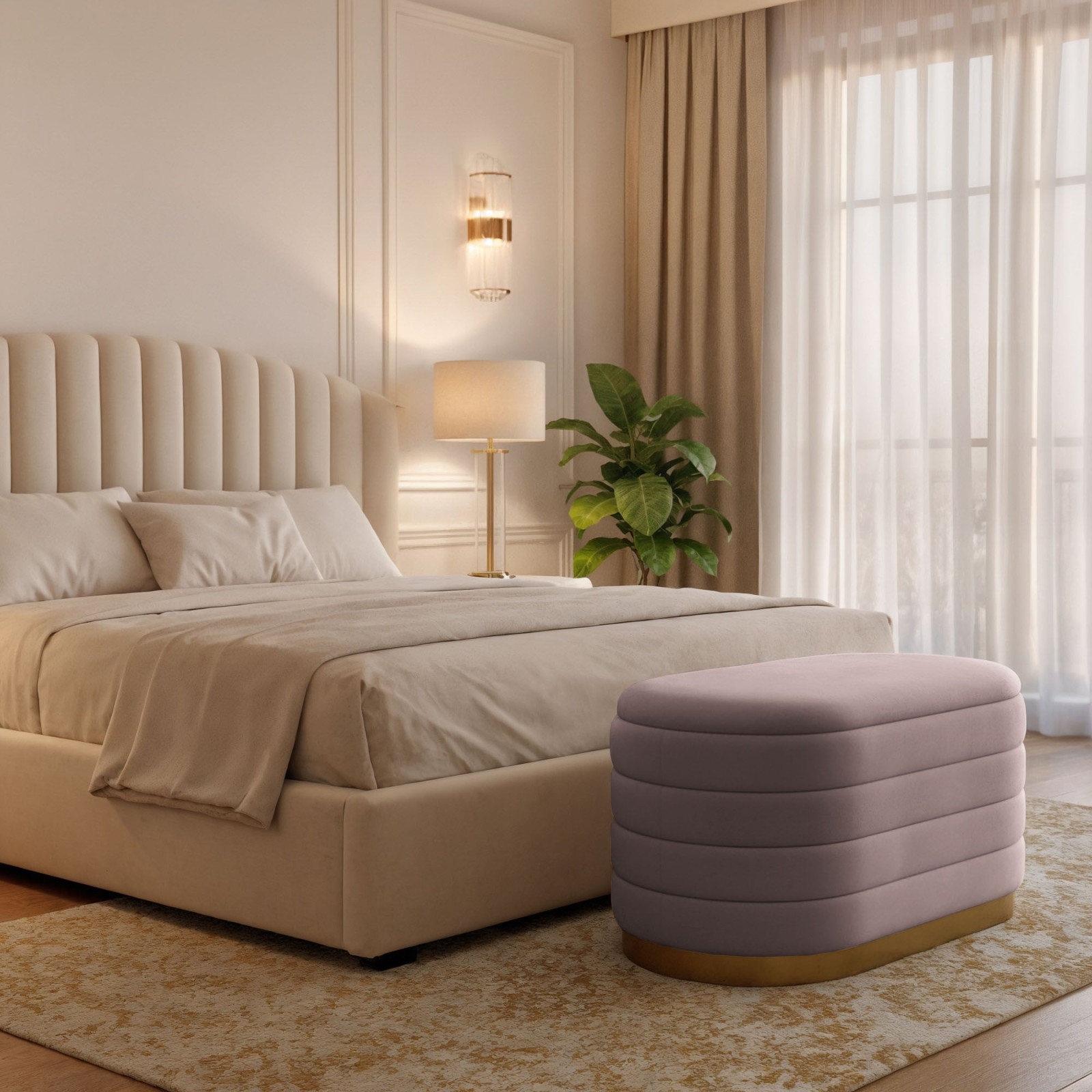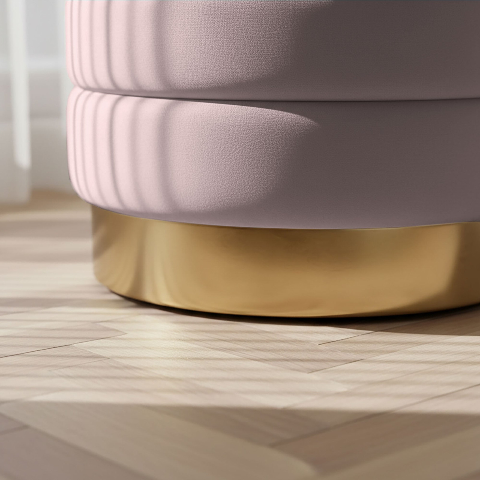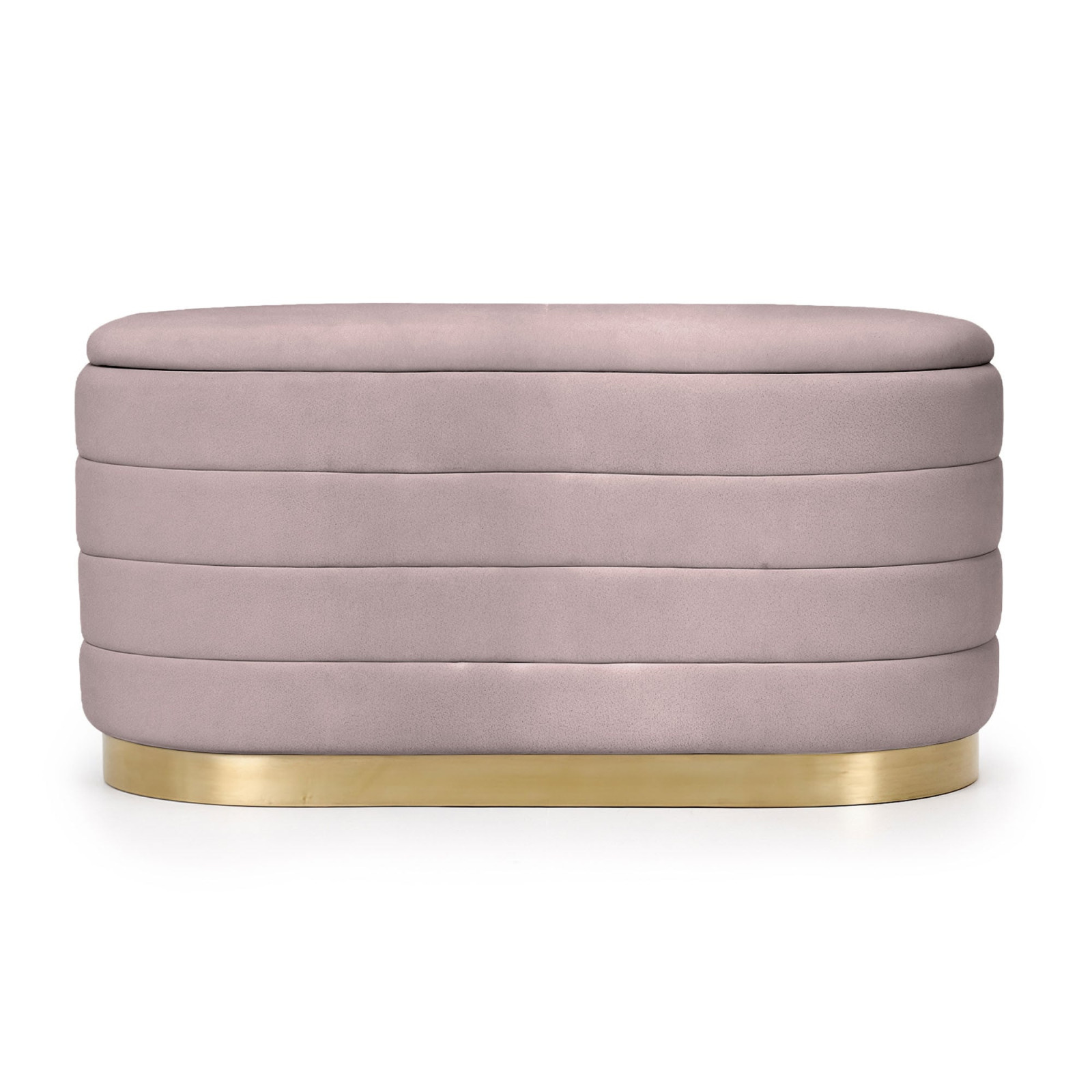 A BELLA tárolós puff a modern glamour stílus megtestesítője, amely lenyűgöző esztétikát párosít praktikus funkcionalitással. A puha, bársony kárpit gyönyörű púderrózsaszín árnyalata és a vízszintes steppelés kifinomult eleganciát kölcsönöz a búторnak, míg az ovális forma tökéletesen illeszkedik az organikus formák iránti legújabb trendekhez. A stabil MDF konstrukció és az arany színű fém talp nemcsak tartósságot, hanem egyedi karaktert is biztosít.