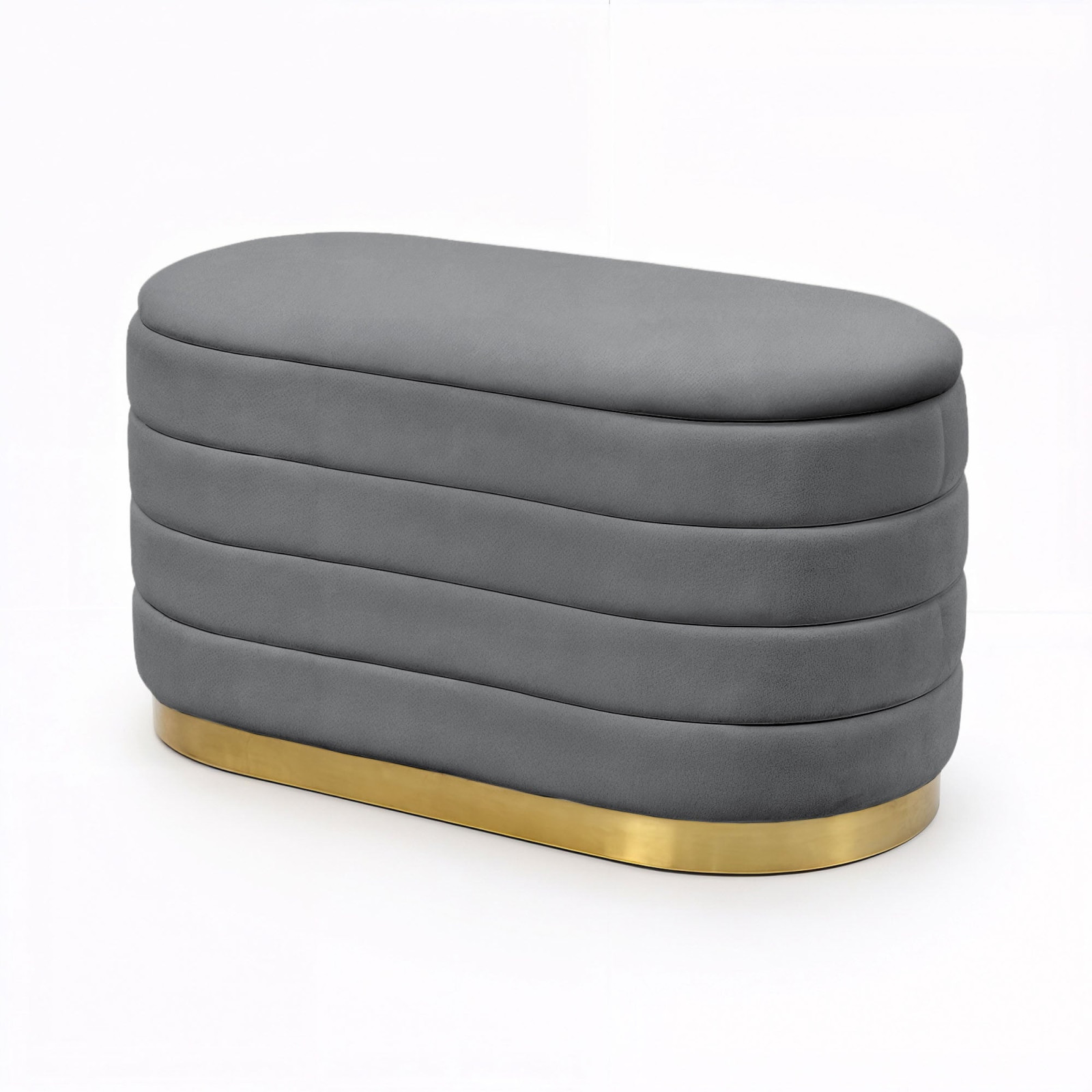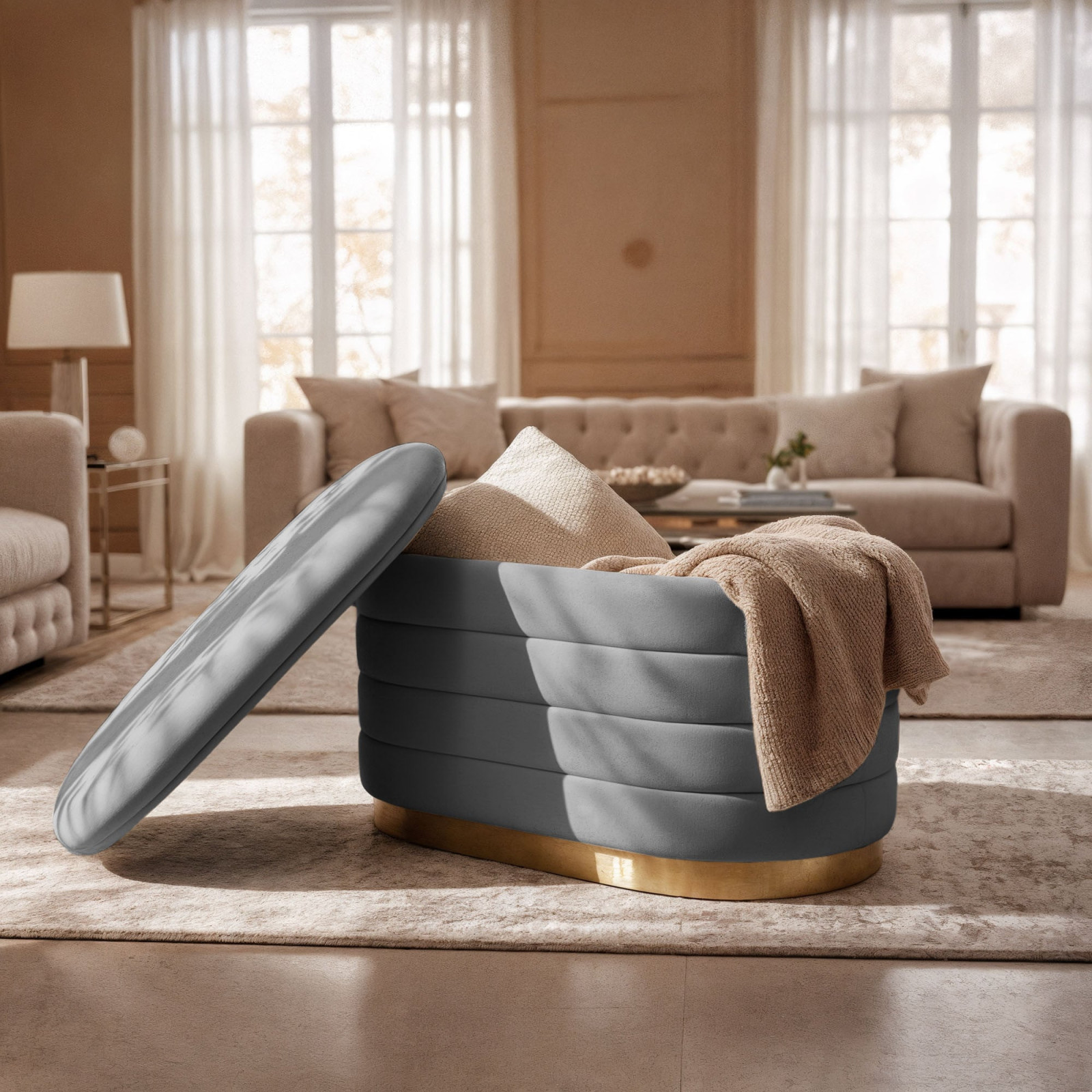 Elegáns tárolós puff welur kárpittal és praktikus nyitható tetővel, amely stílusos ülőhelyet és tárolóhelyet biztosít modern glamour stílusú otthonokba.