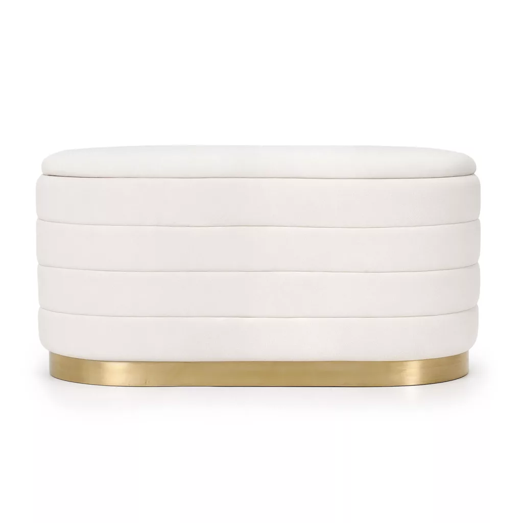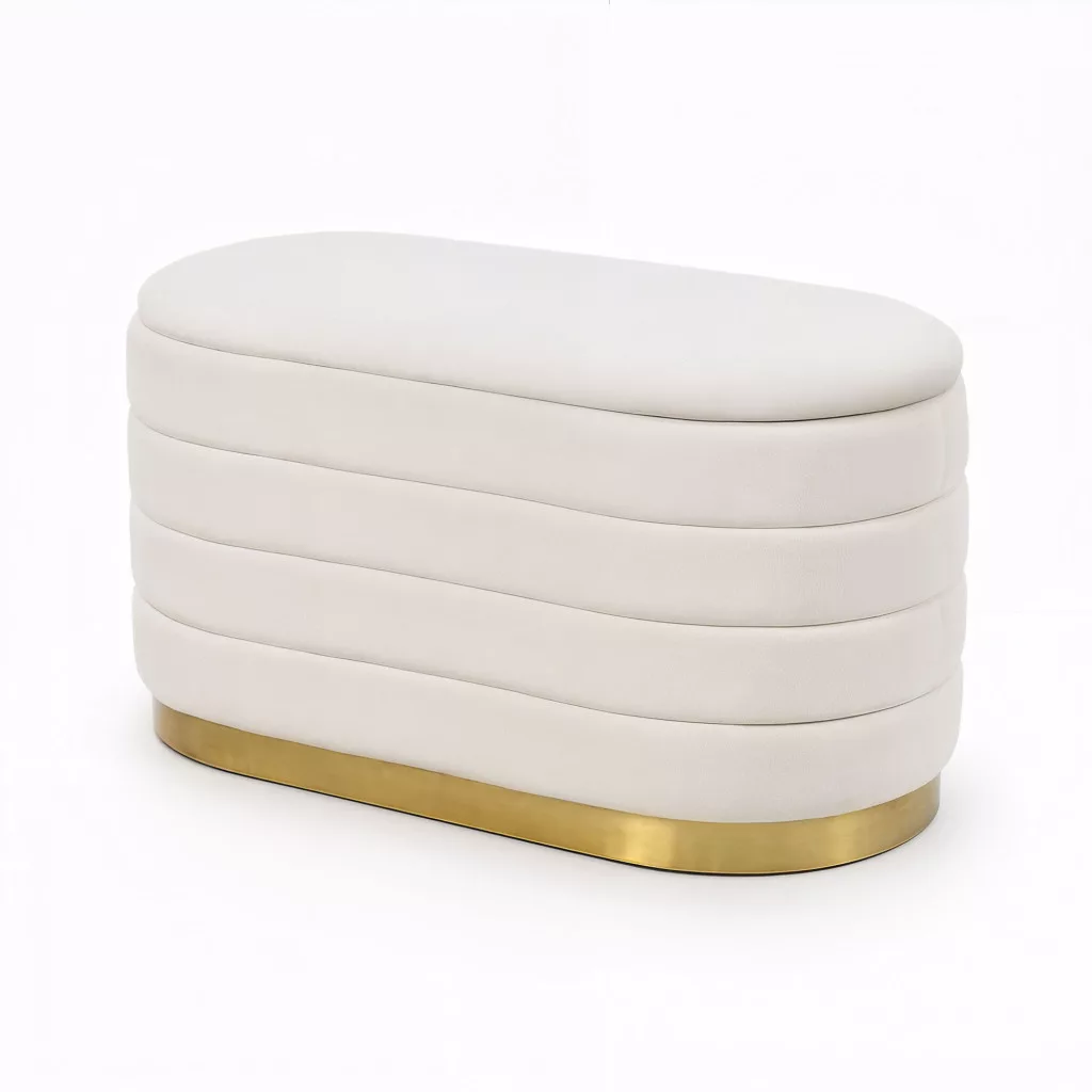 Elegáns, ovális formájú tárolós puff krémszínű welur kárpittal és arany színű fém alappal. Tökéletes választás modern glamour stílusú otthonokba, ahol a stílus és a praktikum találkozik.