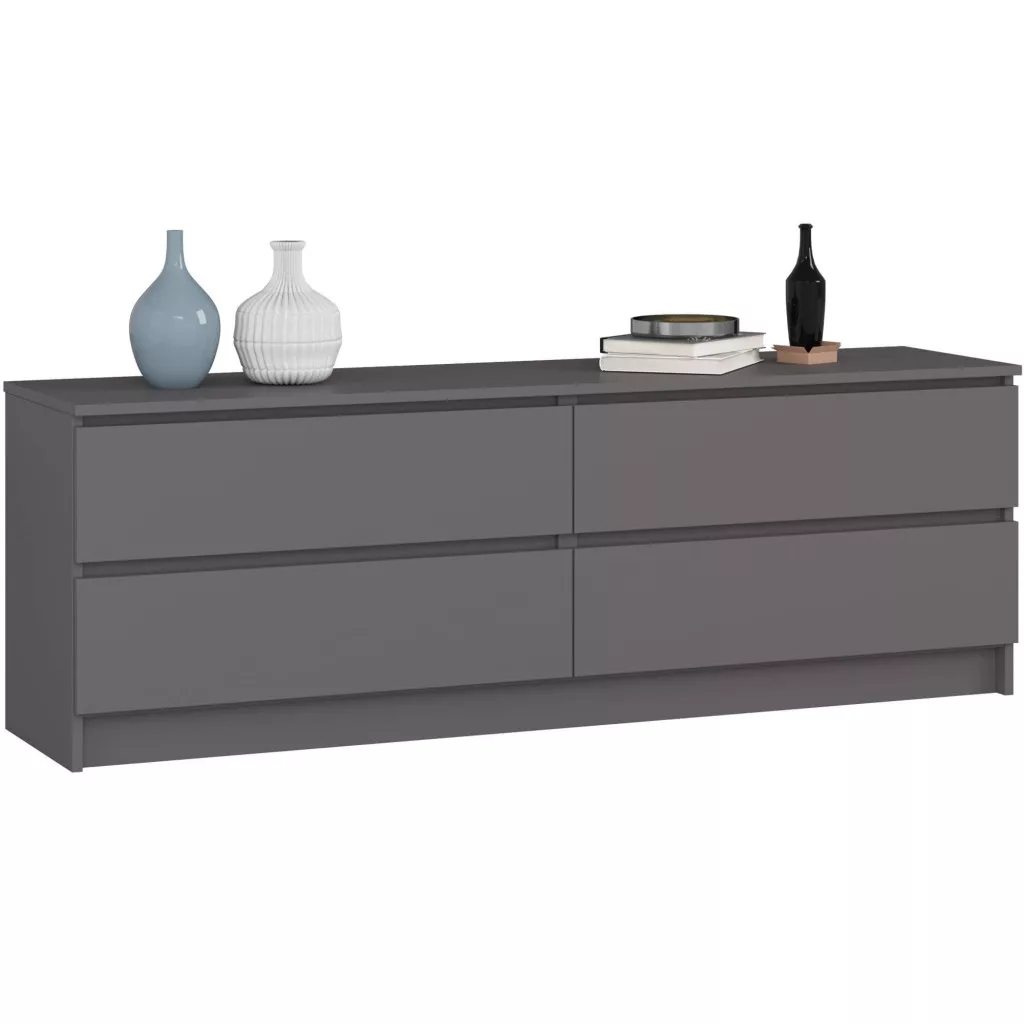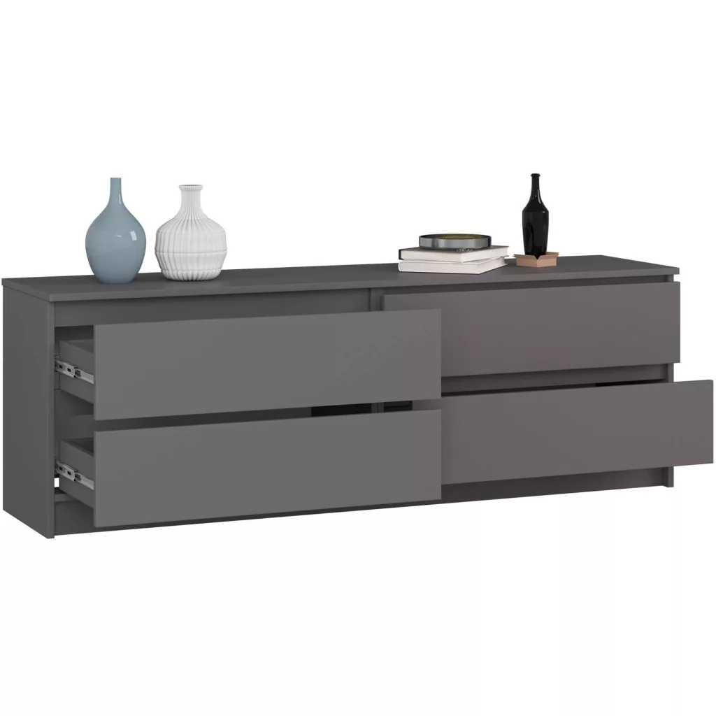 Ez a 160 cm széles komód tökéletes választás azoknak, akik modern és praktikus tárolási megoldást keresnek. A grafitszürke színű, laminált bútorlapból készült darab négy tágas fiókjával maximális helykihasználást biztosít, miközben elegáns megjelenésével bármely helyiség dísze lehet.