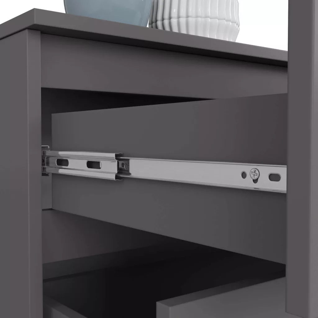 A kiváló minőségű, 16 mm vastag laminált bútorlap és az ABS élzárás tartósságot és hosszú élettartamot garantál. A fiókok görgős síneken futnak, ami könnyű és csendes működést biztosít, a beépített fiókvezető rendszer pedig megakadályozza a véletlen kicsúszást.