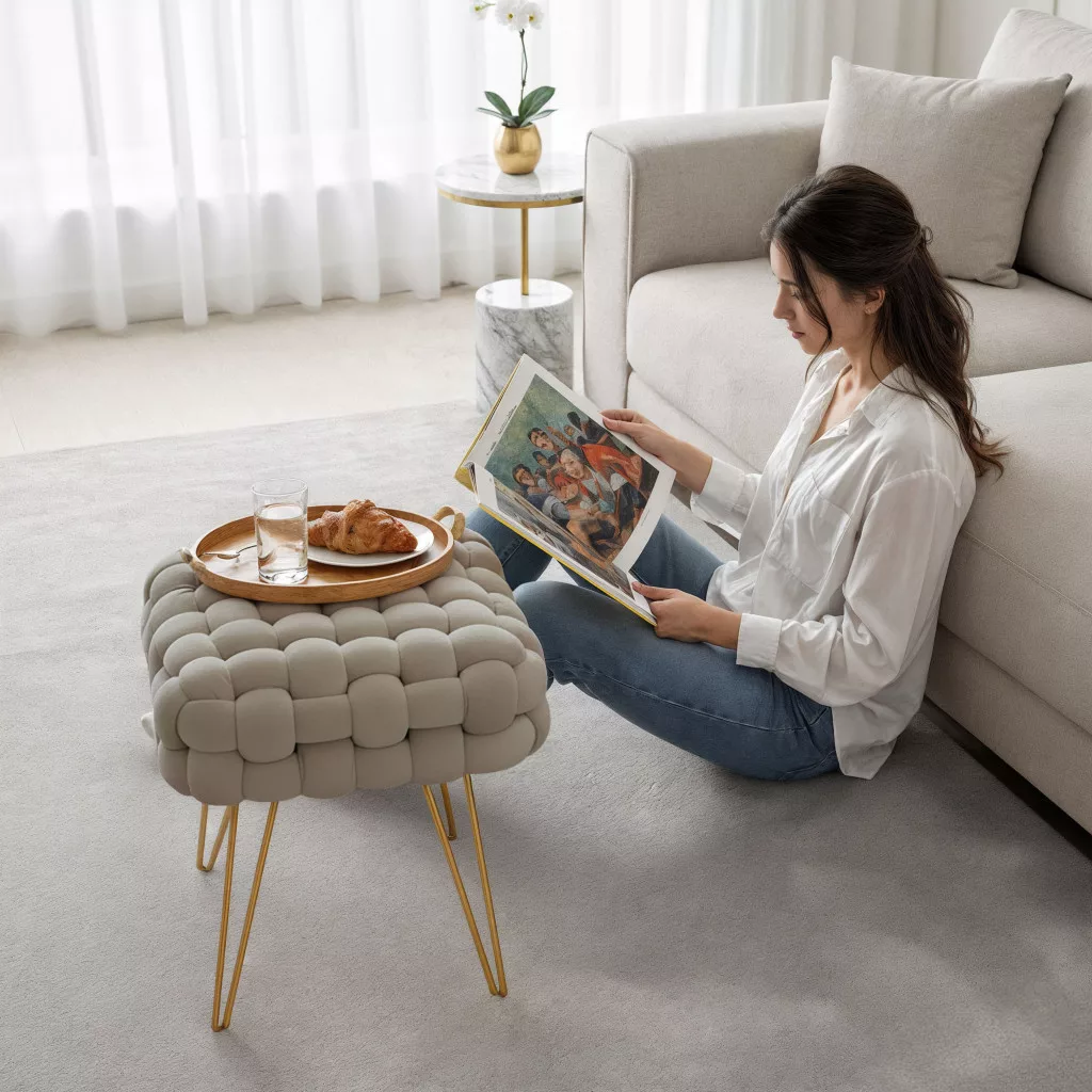 AKORD DOTTY Tapicerowana Pufa Welur Przygaszony Beż Plecione Siedzisko