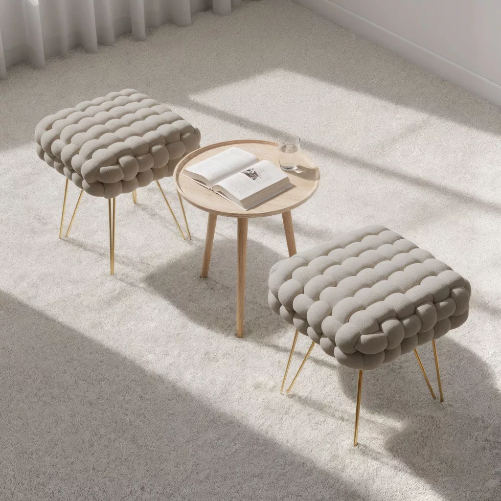 • Csomózott fonású tapicerka: A vastag, egymásba fonódó welúr csíkok egyedi textúrát és vizuális mélységet adnak, így a pufa művészi alkotássá válik