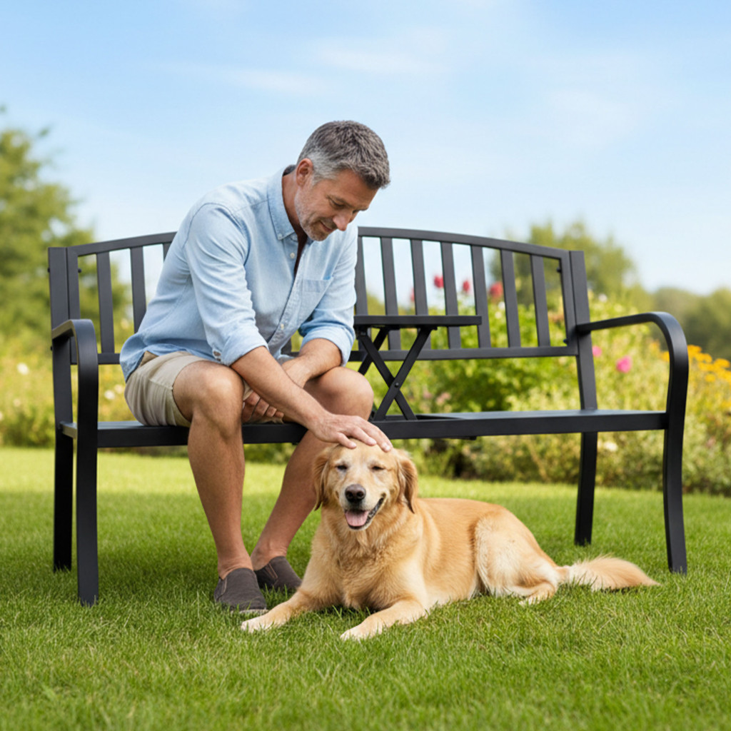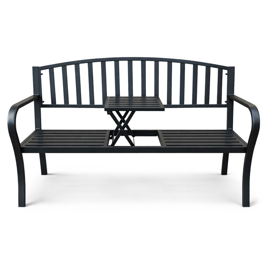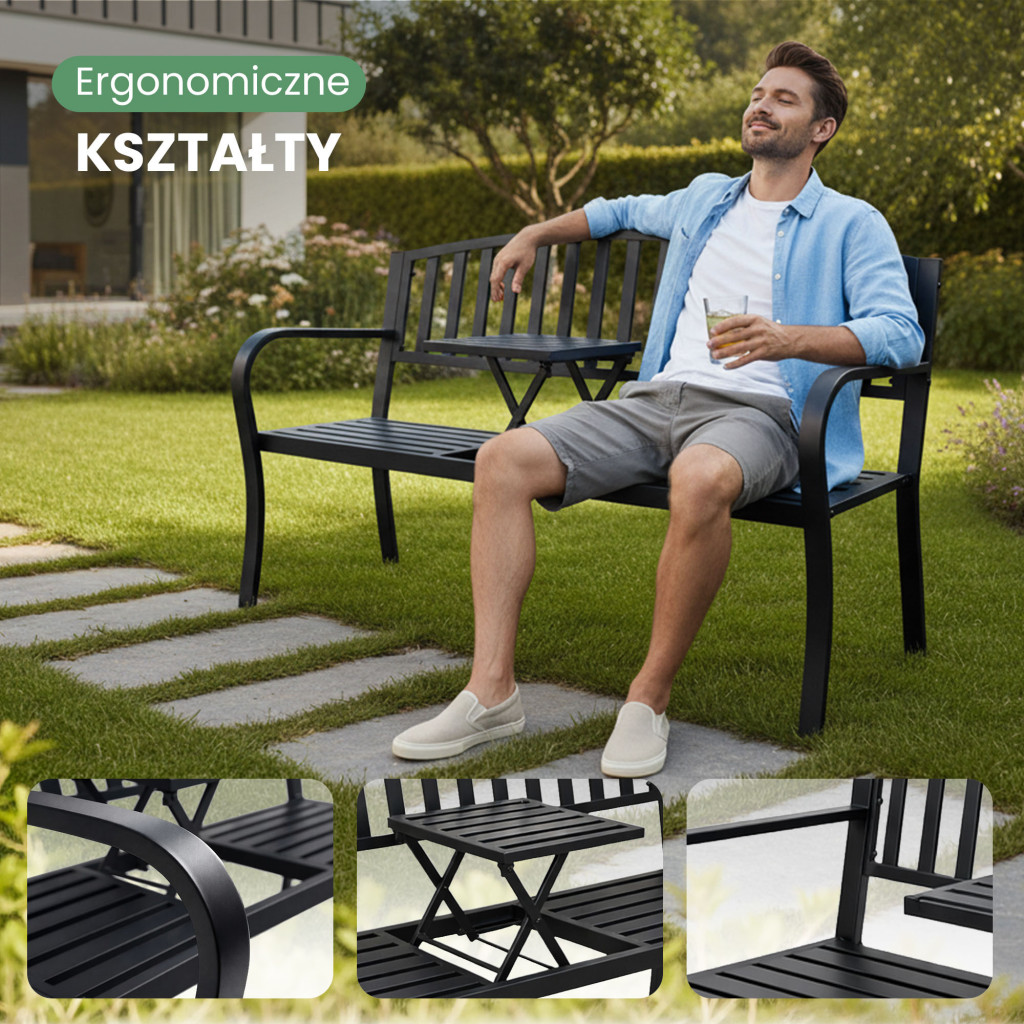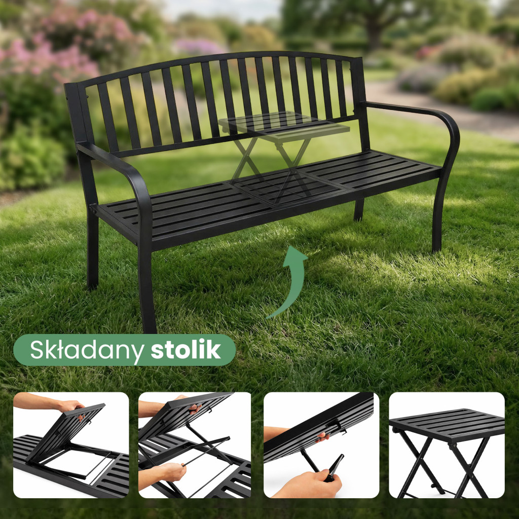 Elegáns fekete kerti pad beépített kihajtható asztallal, amely tökéletes választás modern kertekbe és teraszokra. A strapabíró fém konstrukció hosszú élettartamot és kényelmes pihenést biztosít.