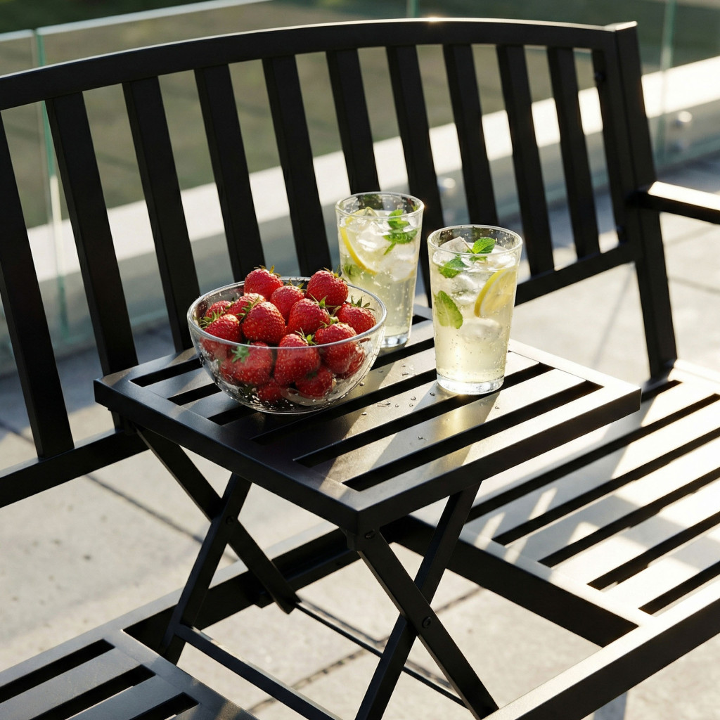 A DUO kerti pad egyedülálló módon ötvözi a modern designt a praktikus funkcionalitással. A pad közepébe integrált, kihajtható asztal lehetővé teszi, hogy kényelmesen elhelyezze italait, snackjeit vagy akár egy jó könyvet anélkül, hogy külön bútordarabra lenne szüksége. Az elegáns fekete fém konstrukció nemcsak időtálló megjelenést kölcsönöz, hanem kiváló időjárásállóságot is garantál.