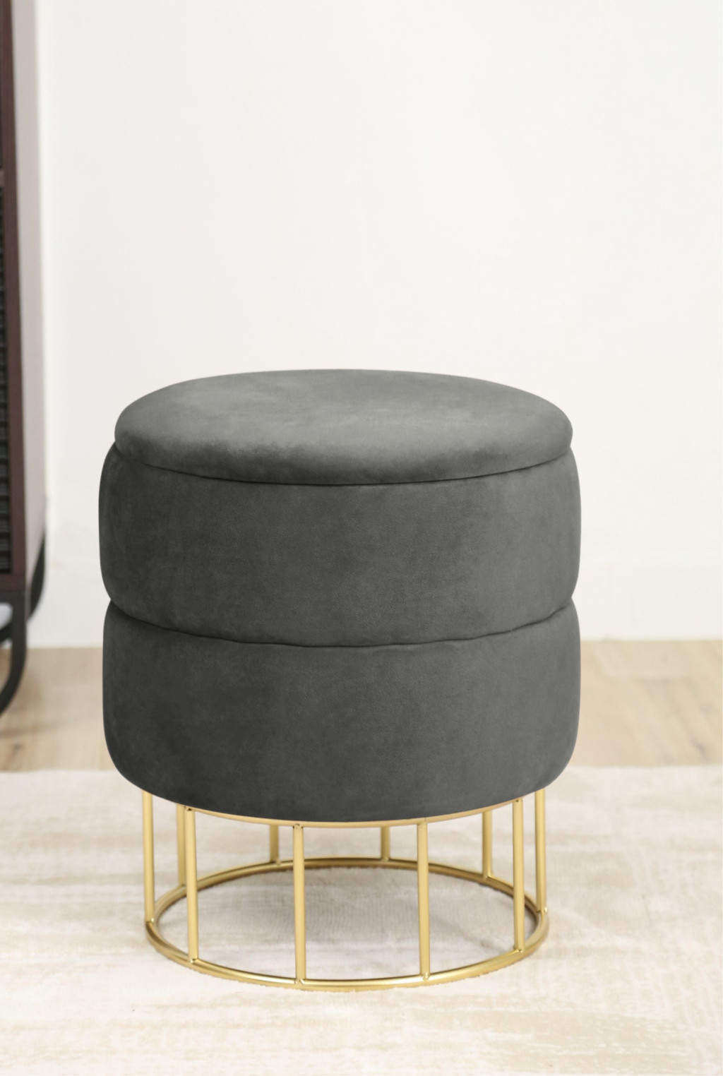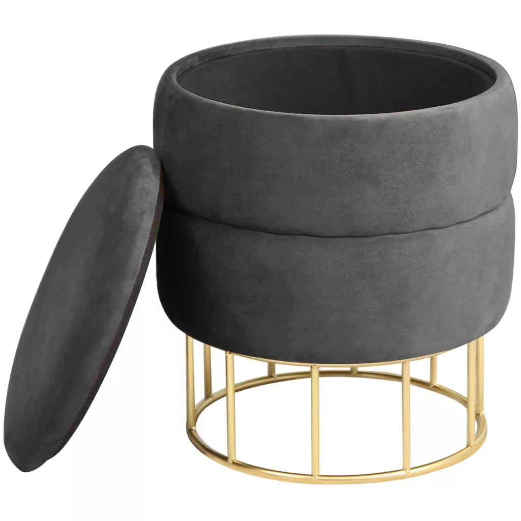 Elegáns, többfunkciós velúr puff beépített tárolóval és modern arany színű fém lábakkal, amely tökéletes kiegészítője lehet nappalijának vagy hálószobájának.
