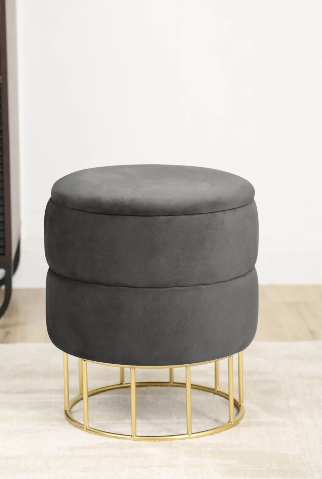 Az Elza puff a modern design és a praktikum tökéletes ötvözete. A puha, grafitszürke velúr kárpitozás és az elegáns arany színű fém lábakon nyugvó kialakítás azonnal a helyiség központi elemévé válik. A kényelmes ülőfelület alatt rejtett tárolórekesz található, amely praktikus megoldást kínál a mindennapi tárgyak elhelyezésére.