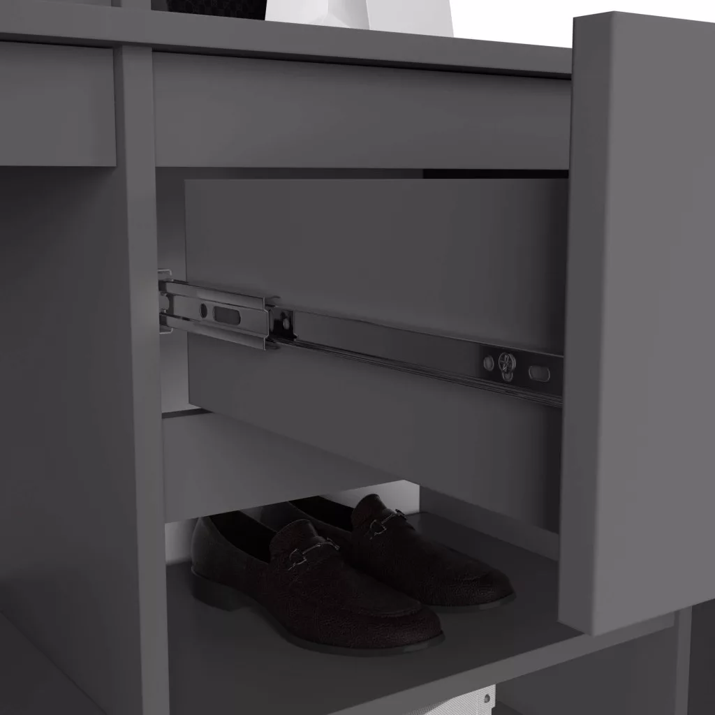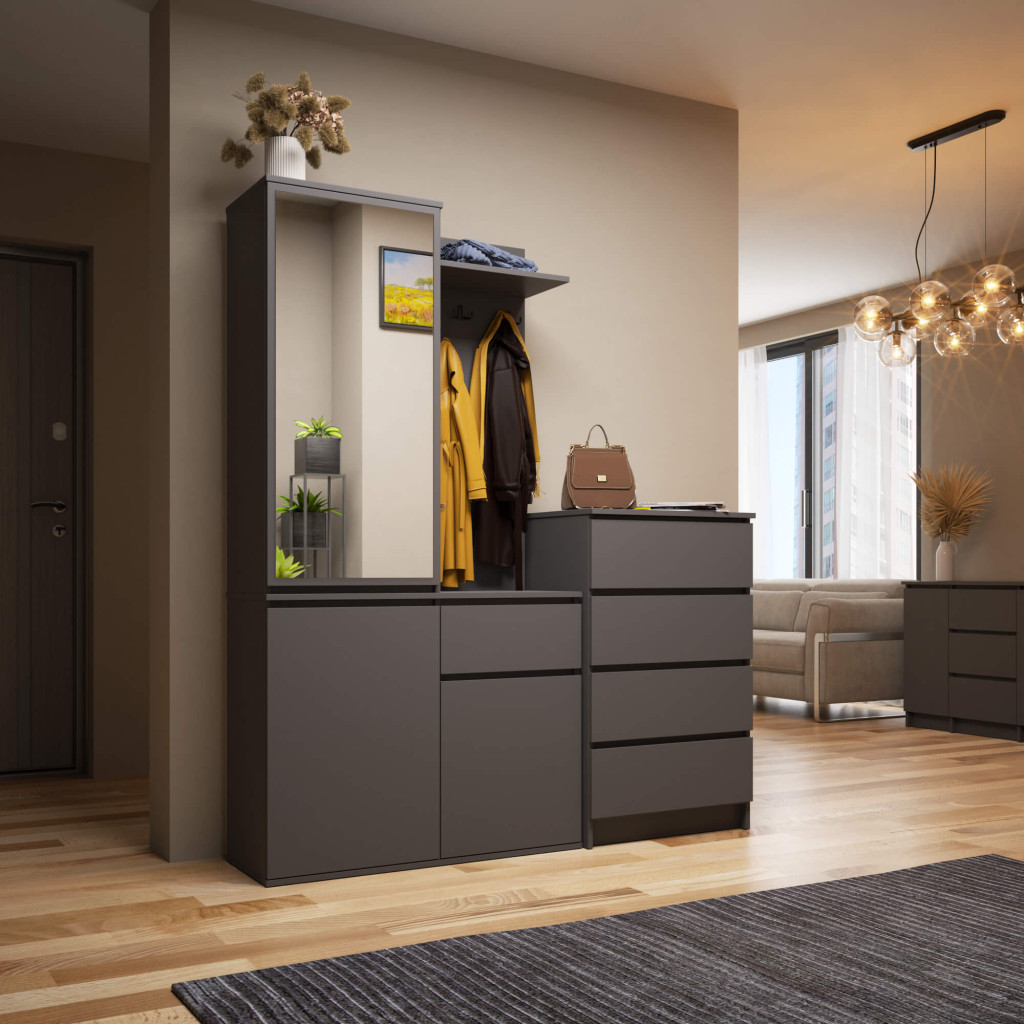 A matt grafit-szürke színvilágú szekrény kiváló minőségű laminált bútorlapból készült, ABS élzárással a tartósság érdekében. A beépített tükör, 4 akasztó, fiók és 7 polc biztosítja, hogy minden előszobai holminak meglegyen a maga helye.