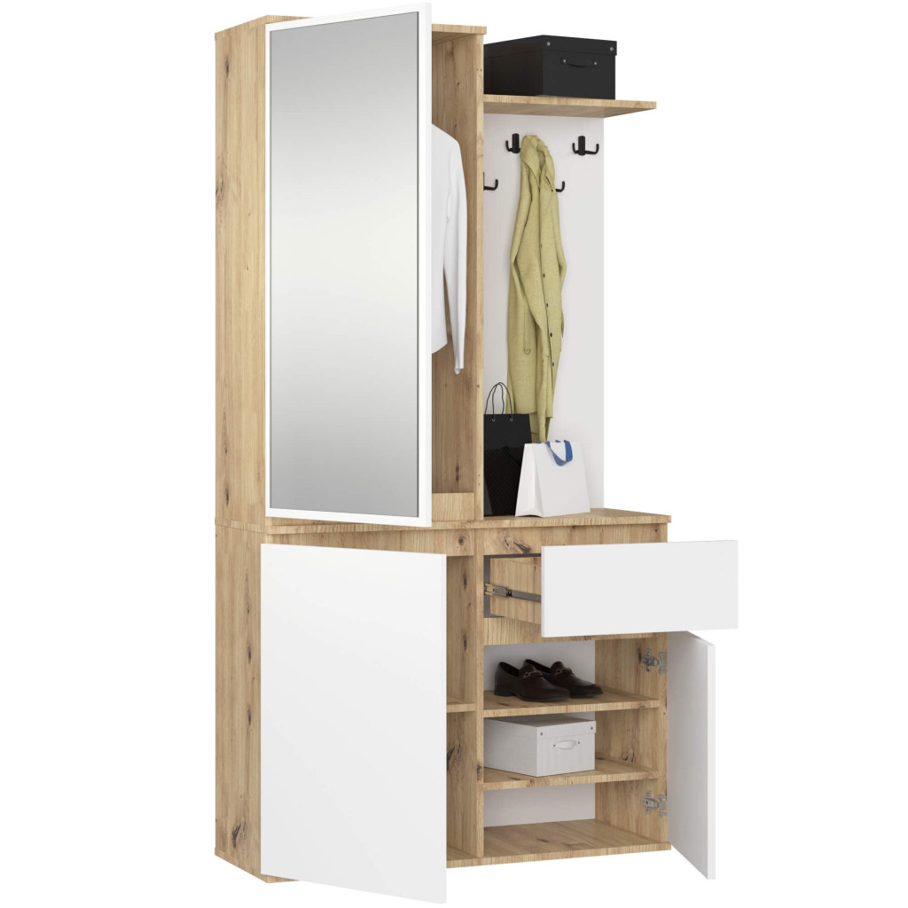 Az Entro előszobai szekrényrendszer tökéletes megoldást kínál a szűk előterek és folyosók praktikus berendezéséhez. A 95 cm széles bútor ötvözi a tükrös szekrényt, ruhaakasztót és cipőtárolót, mindezt letisztult, modern dizájnba csomagolva. Az artisan tölgy és fehér színkombináció elegáns megjelenést kölcsönöz a bútornak.