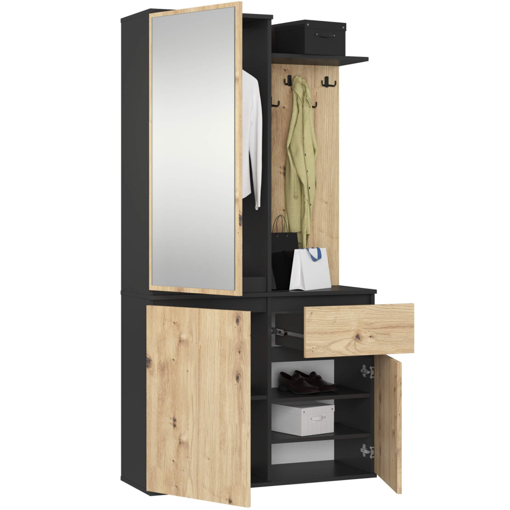Az Entro előszobai szekrényrendszer tökéletes megoldást kínál a korlátozott méretű előterekbe. A 95 cm széles bútor ötvözi a praktikus tárolási megoldásokat az elegáns megjelenéssel, fekete és artisan tölgy színkombinációban. A beépített tükrös ajtó, akasztók és polcrendszer maximális funkcionalitást biztosítanak.