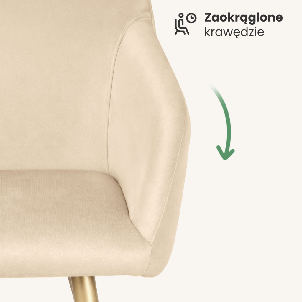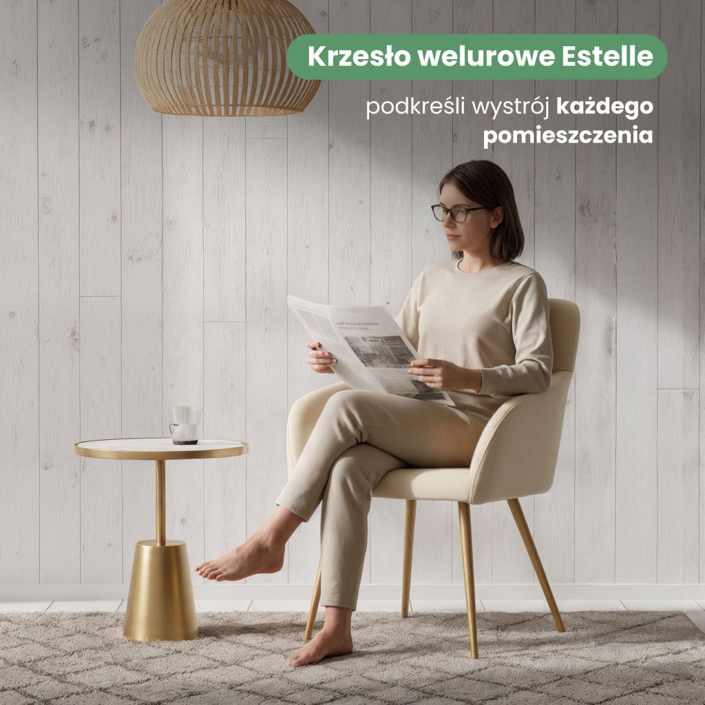 Az Estelle welúr szék tökéletes választás azok számára, akik a minimalista eleganciát és a kényelmet keresik. A puha bézs welúr kárpit és az arany színű fém lábak harmonikus kombinációja modern és klasszikus enteriőrökbe egyaránt illeszkedik.