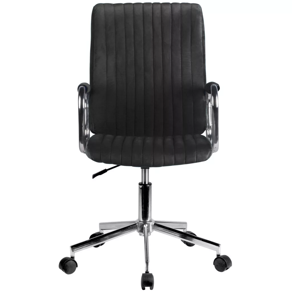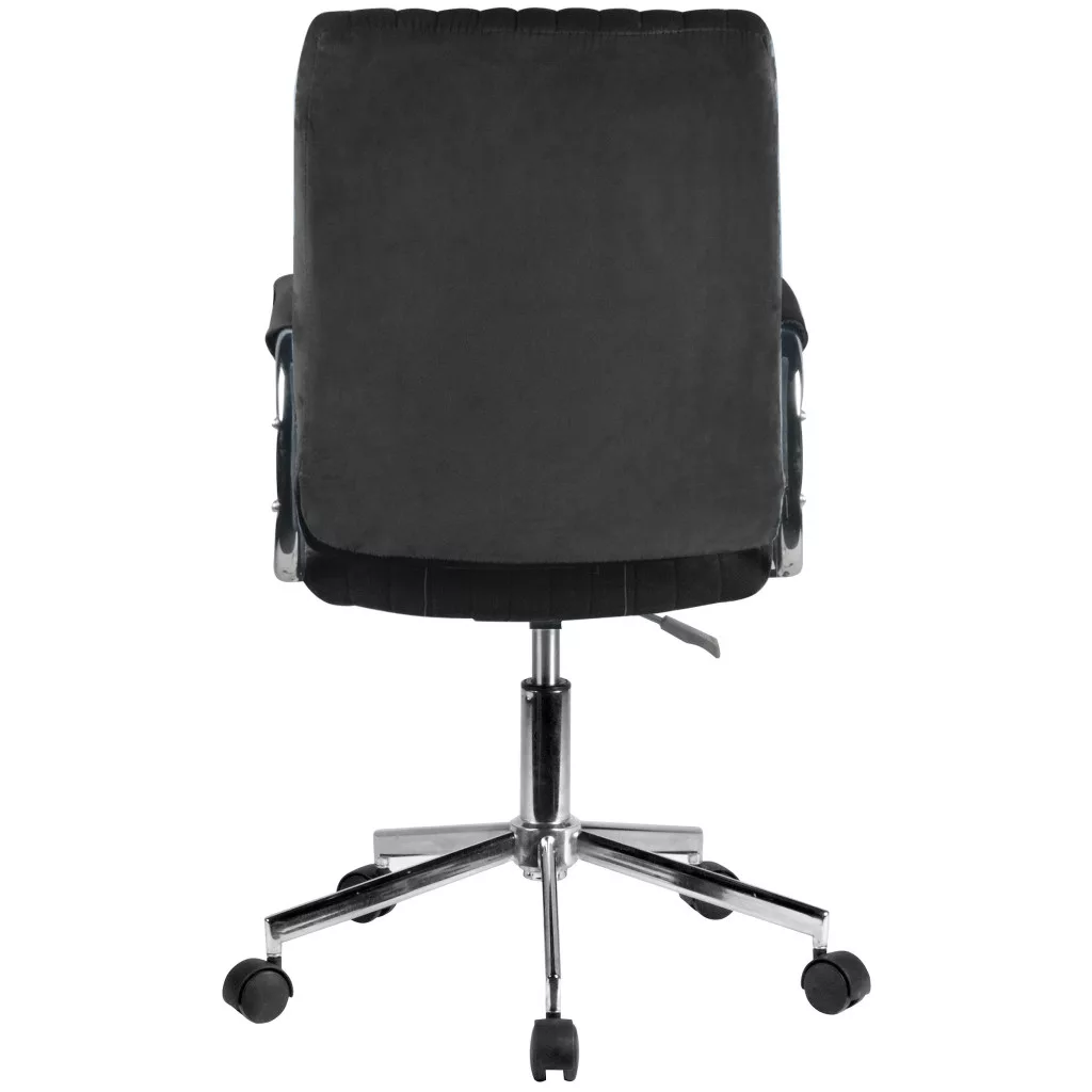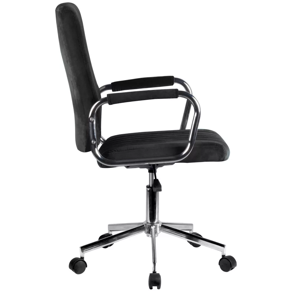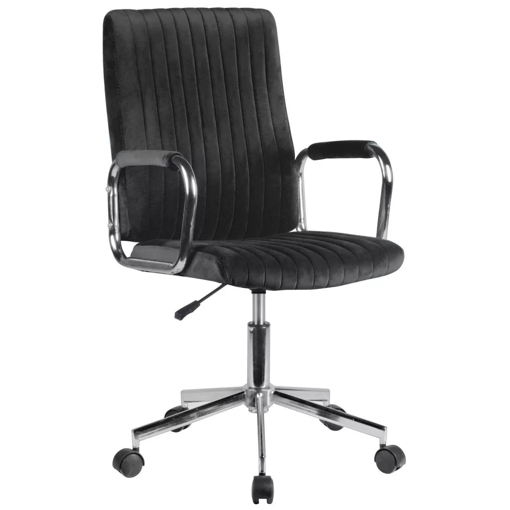 Elegáns, fekete velúr irodai szék állítható magassággal és króm részletekkel, amely tökéletes választás a modern irodai környezetbe.