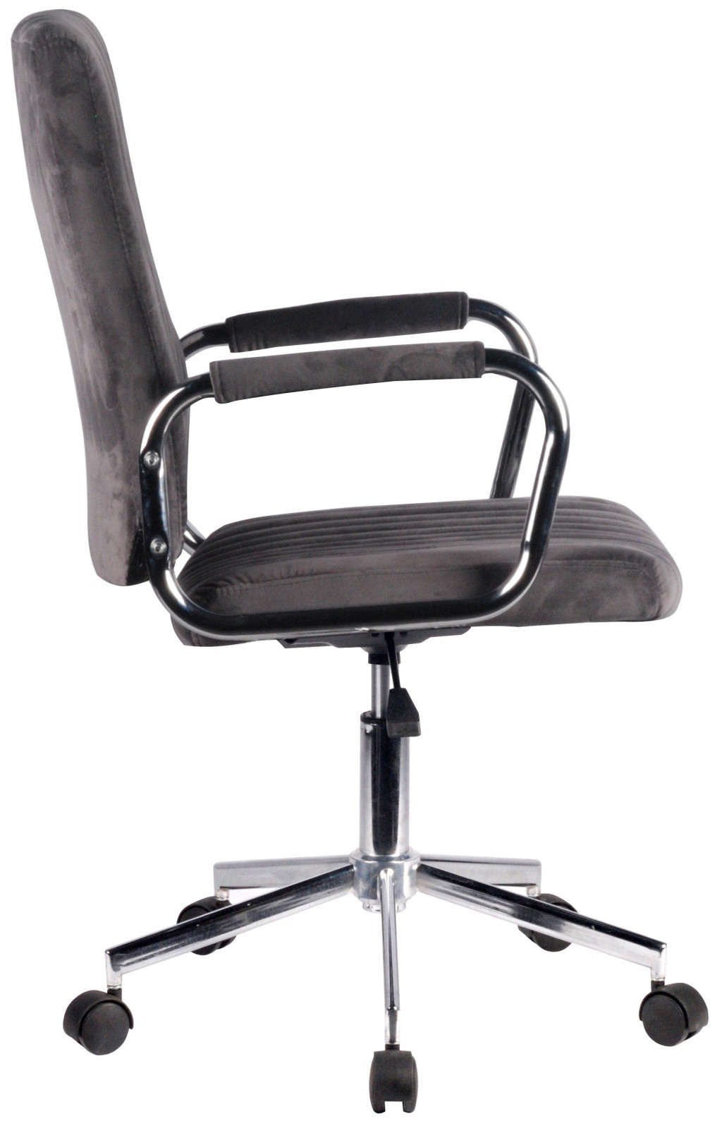 Elegáns, modern vonalvezetésű irodai forgószék szürke welur kárpitozással és krómozott fém vázzal, amely tökéletesen ötvözi a kényelmet és a stílust.