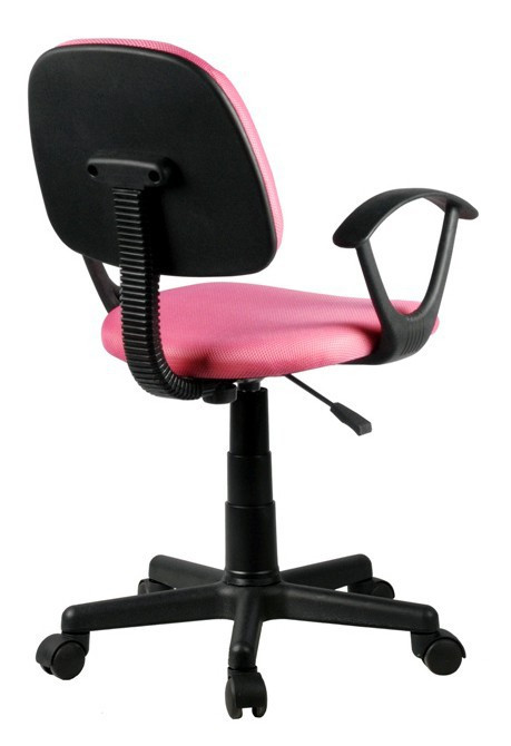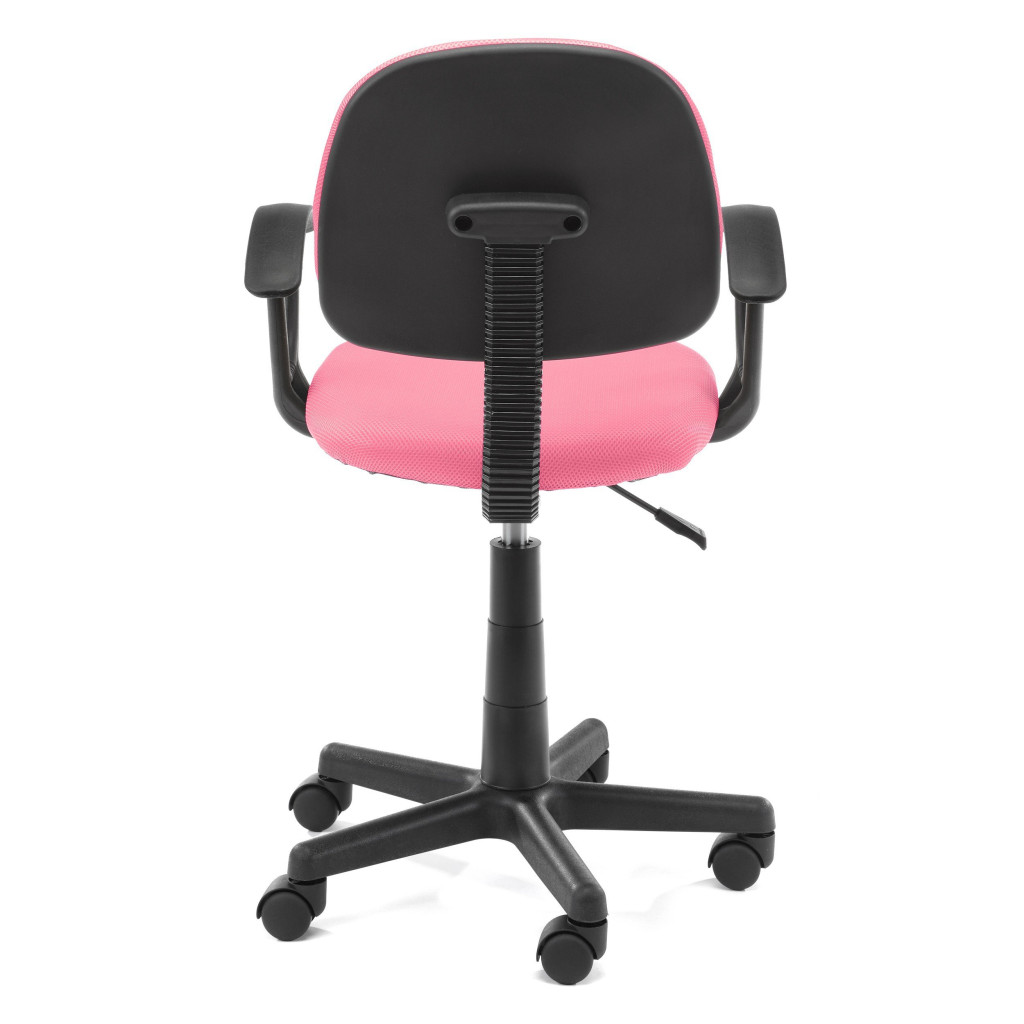 A rózsaszín kárpitozás és a fekete váz elegáns megjelenést kölcsönöz, míg a mesh háttámla kellemes szellőzést biztosít. A szék stabil műanyag lábai és görgői könnyű mozgást tesznek lehetővé a szobában.