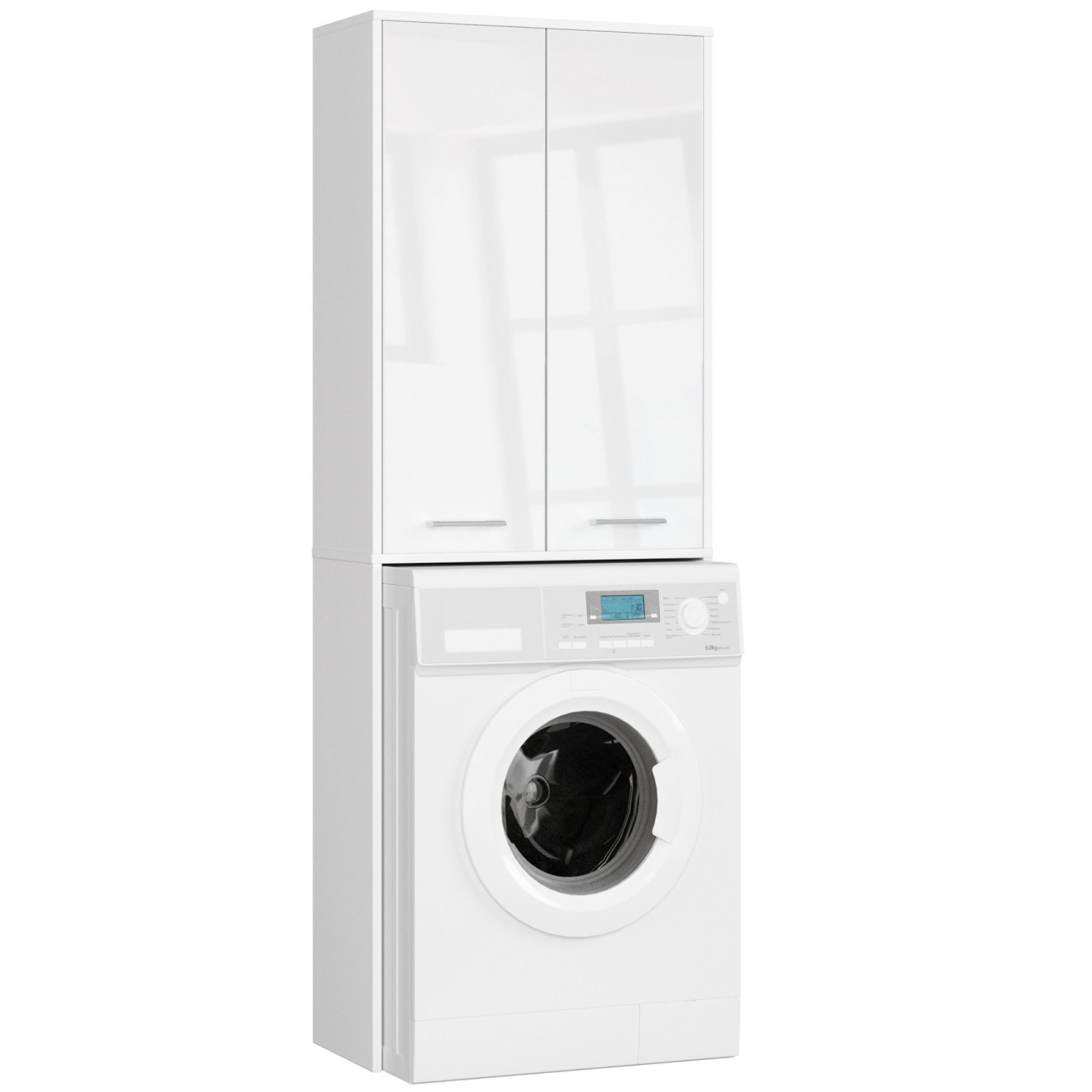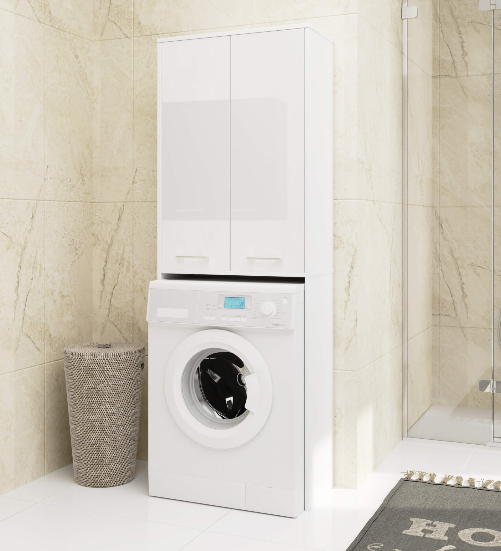 Praktikus, 180 cm magas fürdőszobai szekrény mosógép fölé, 4 polccal és magasfényű fehér ajtókkal, amely maximalizálja a tárolóhelyet kis fürdőszobákban.