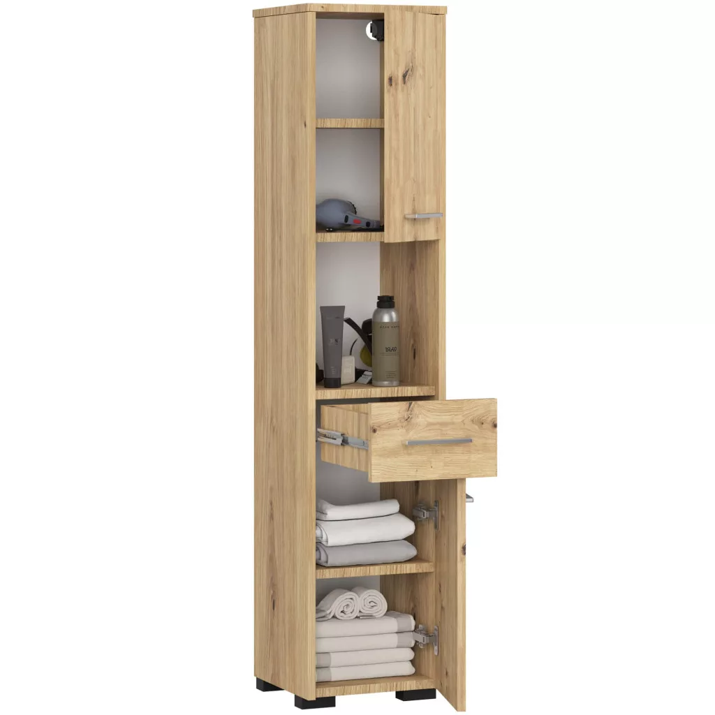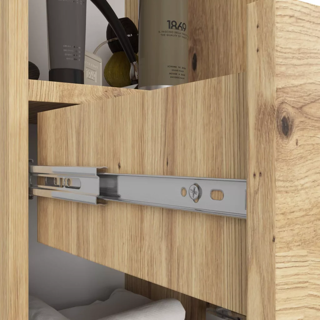 Modern, sokoldalú fürdőszobai állószekrény két ajtóval és egy fiókkal, amely tökéletes tárolási megoldást kínál kis terekbe. Artisan tölgy színben, nedvességálló kivitelben.