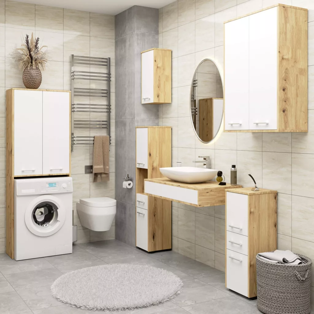 Modern, kétajtós fali fürdőszobai szekrény Artisan tölgy korpusszal és matt fehér frontokkal, praktikus tárolási megoldásokkal.