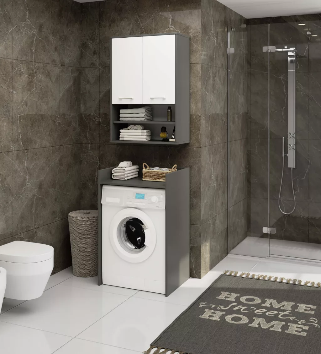 Modern, kéttónusú fali fürdőszobaszekrény grafit szürke korpusszal és fehér frontokkal. A 64 cm széles szekrény 2 ajtós tárolóval és 4 praktikus polccal rendelkezik, tökéletes választás minden fürdőszoba számára.