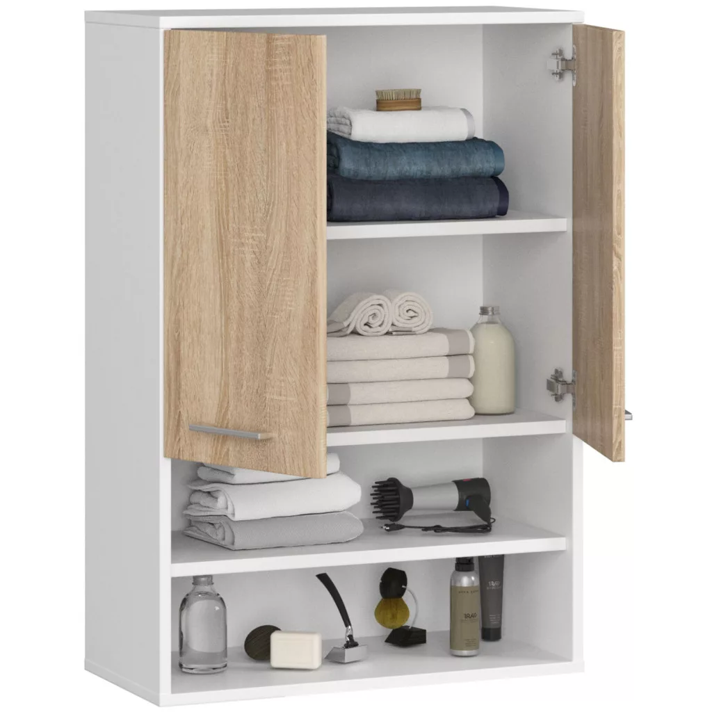Modern, kétajtós fürdőszobai fali szekrény 4 polccal, fehér korpusszal és sonoma tölgy ajtófronttal, amely tökéletes tárolási megoldást kínál a fürdőszobába.