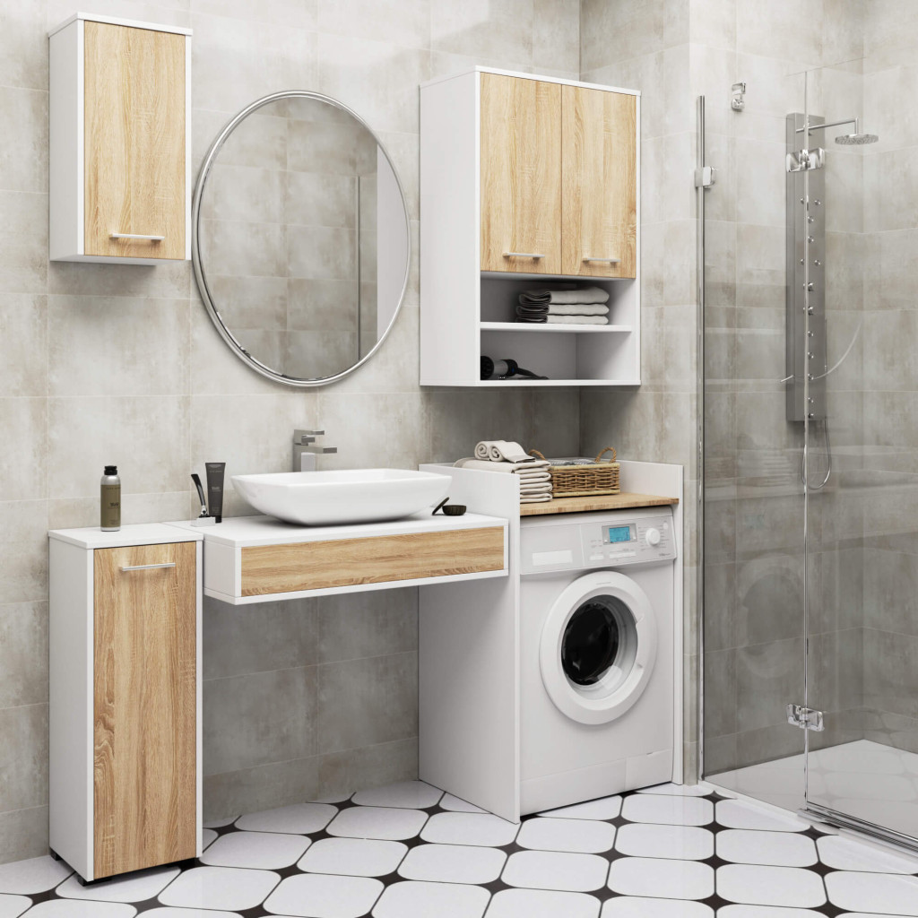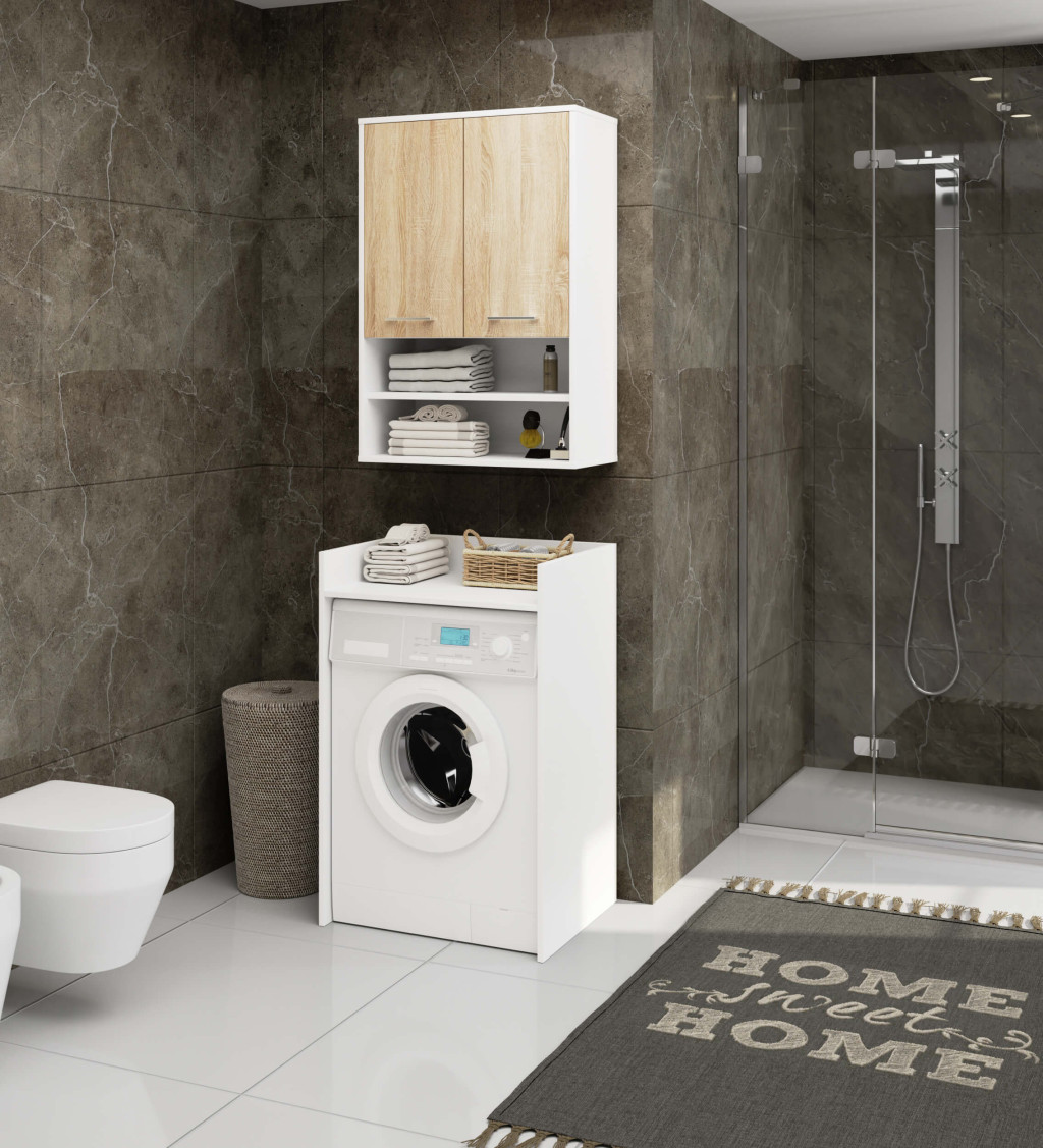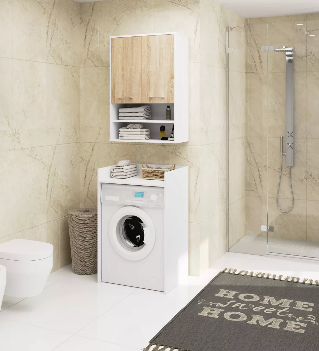 Ez a modern vonalvezetésű fürdőszobai fali szekrény tökéletes kombinációja a funkcionalitásnak és az esztétikumnak. A fehér korpusz és sonoma tölgy ajtófrontok harmonikus összhangja bármely fürdőszoba dekoratív elemévé teszi. A 16 mm vastag laminált bútorlapból készült szekrény tartós és nedvességálló kivitelezésű.