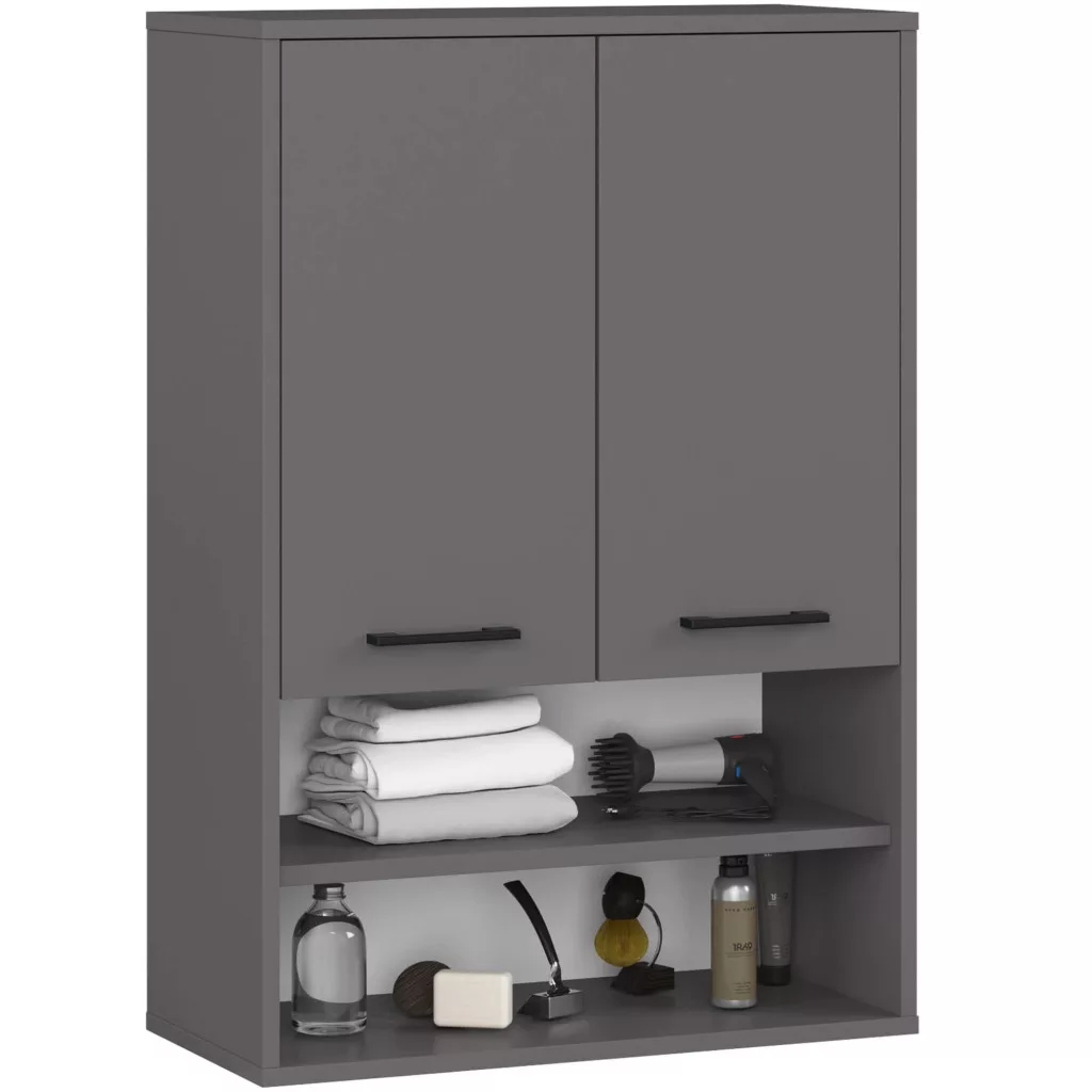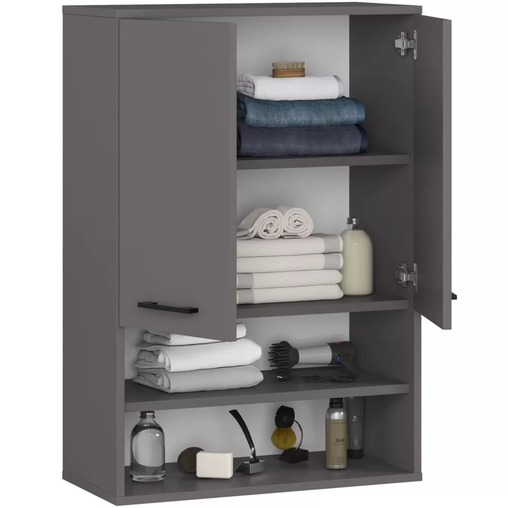 Modern, praktikus fürdőszobai fali szekrény 2 ajtóval és 4 polccal, kiváló minőségű laminált lapból, grafitszürke színben.
