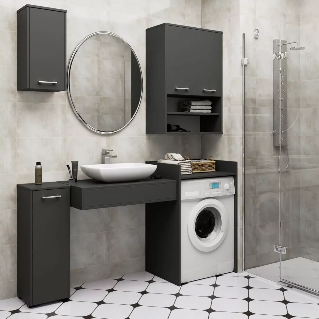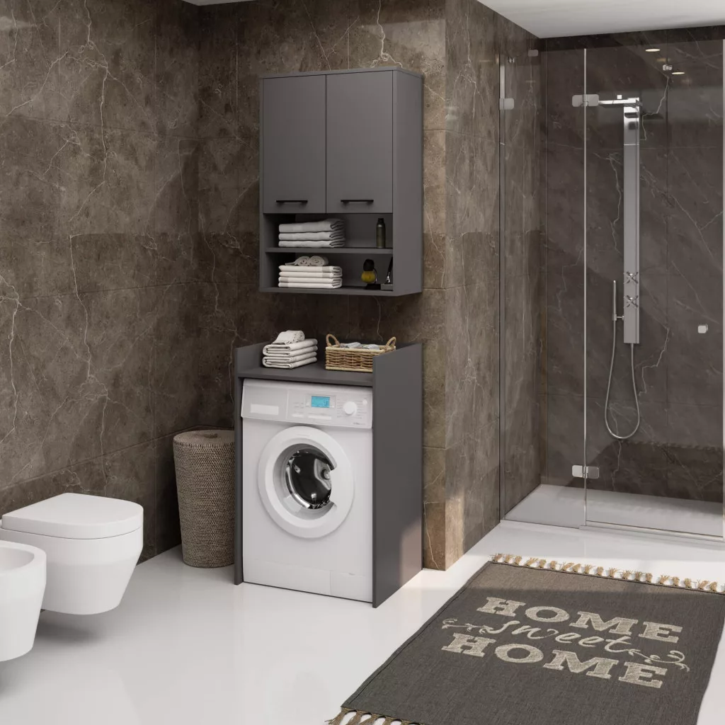 A grafitszürke színű szekrény elegáns fekete fogantyúkkal van felszerelve, és tökéletesen illeszkedik bármilyen modern fürdőszobai környezetbe. A szekrény mosógép fölé vagy más fürdőszobai bútorok mellé is telepíthető, optimális helykihasználást biztosítva.