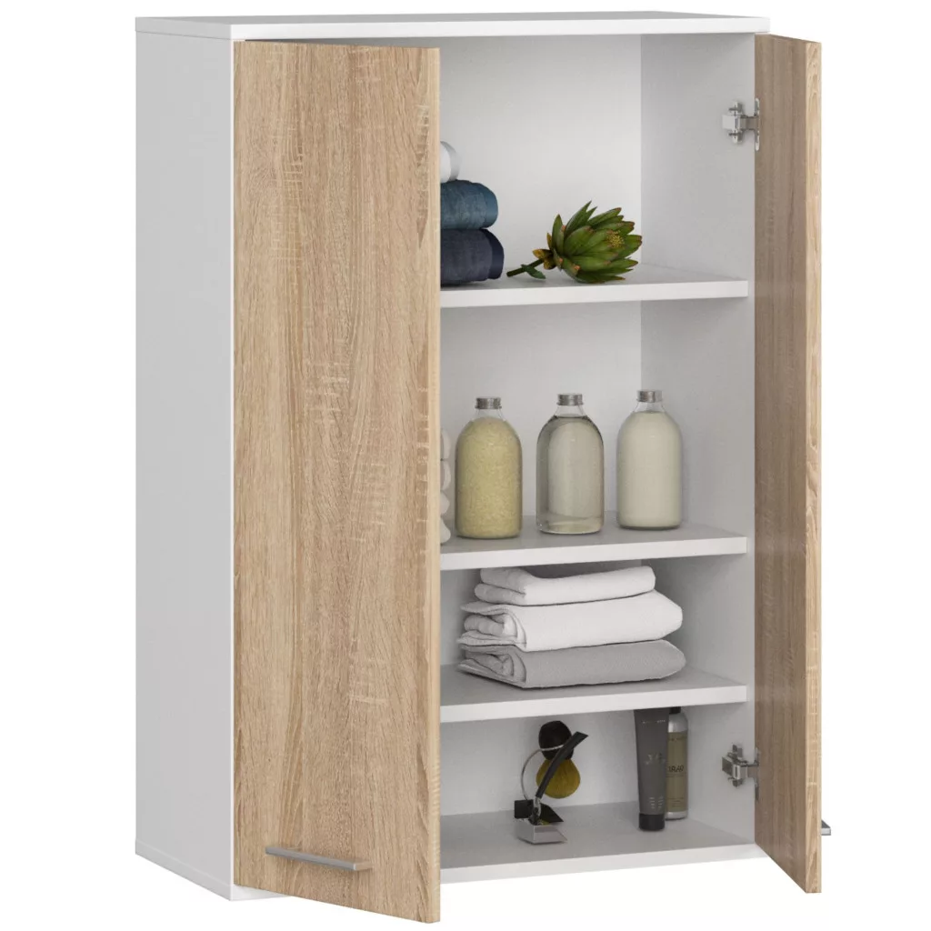 Praktikus, modern fürdőszobai fali szekrény 4 belső polccal, fehér korpusszal és sonoma tölgy ajtófronttal, amely tökéletes tárolási megoldást kínál.
