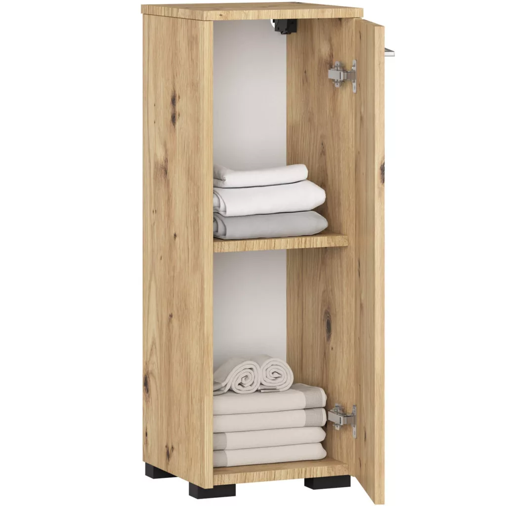 Kompakt, praktikus fürdőszobai állószekrény egy ajtóval és belső polccal, Artisan tölgy kivitelben. Ideális kisebb fürdőszobákba tárolási megoldásként.