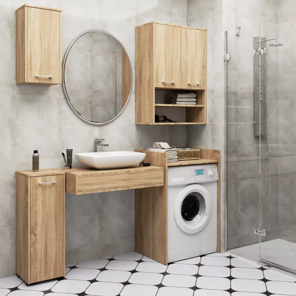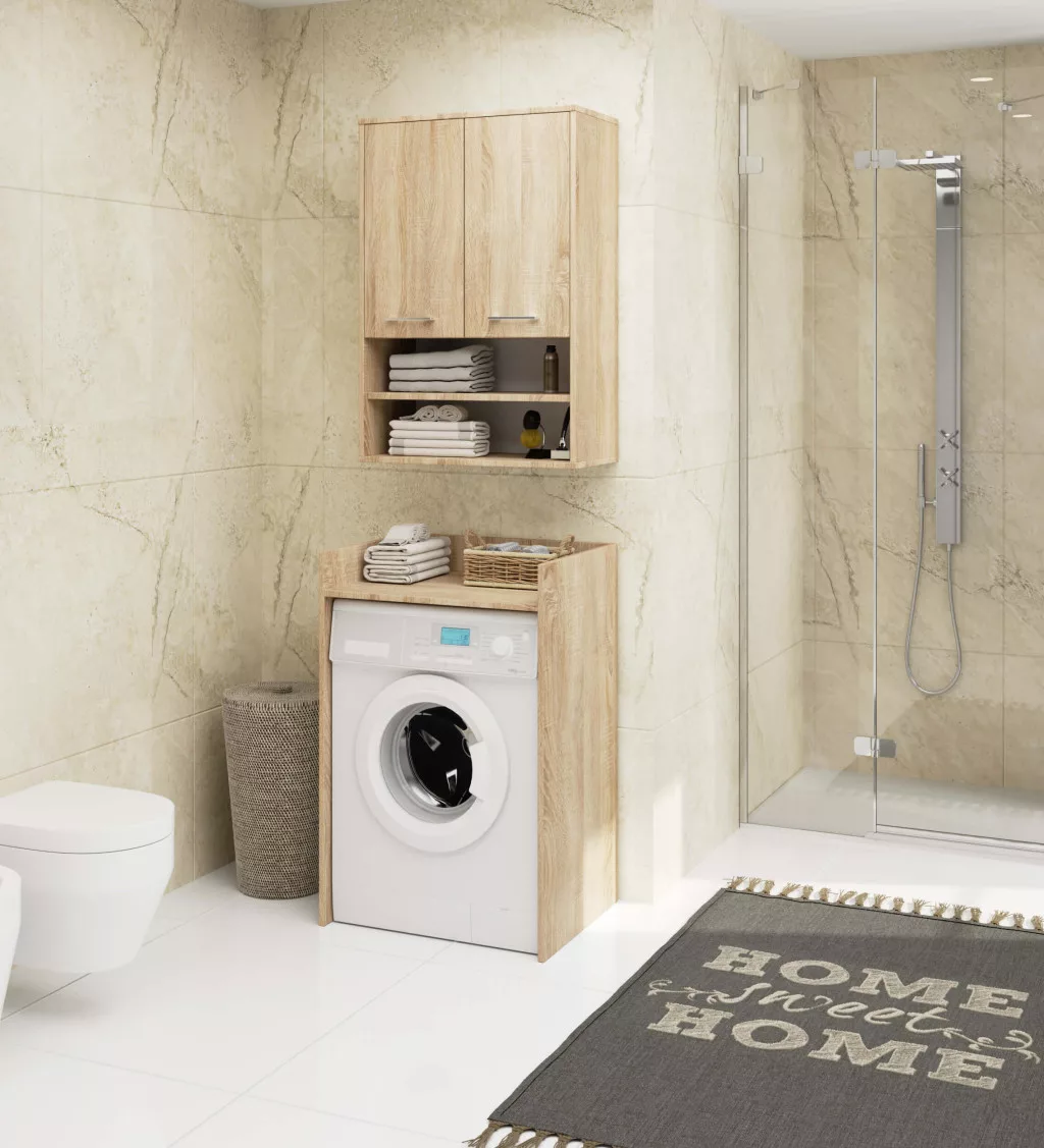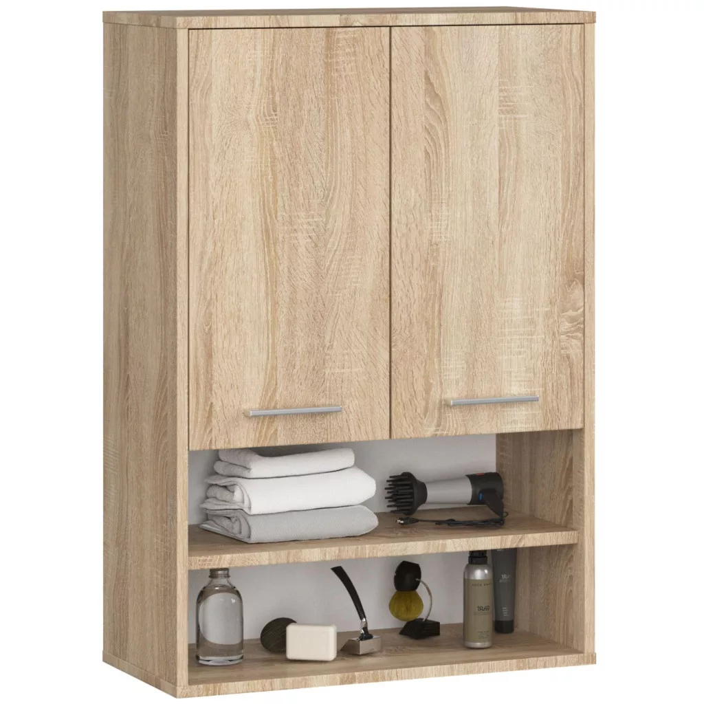 Praktikus, modern fürdőszobai fali szekrény 2 ajtóval és 4 polccal, Sonoma tölgy színben. Kiváló minőségű, 16 mm-es laminált bútorlapból készült, ABS élzárással.