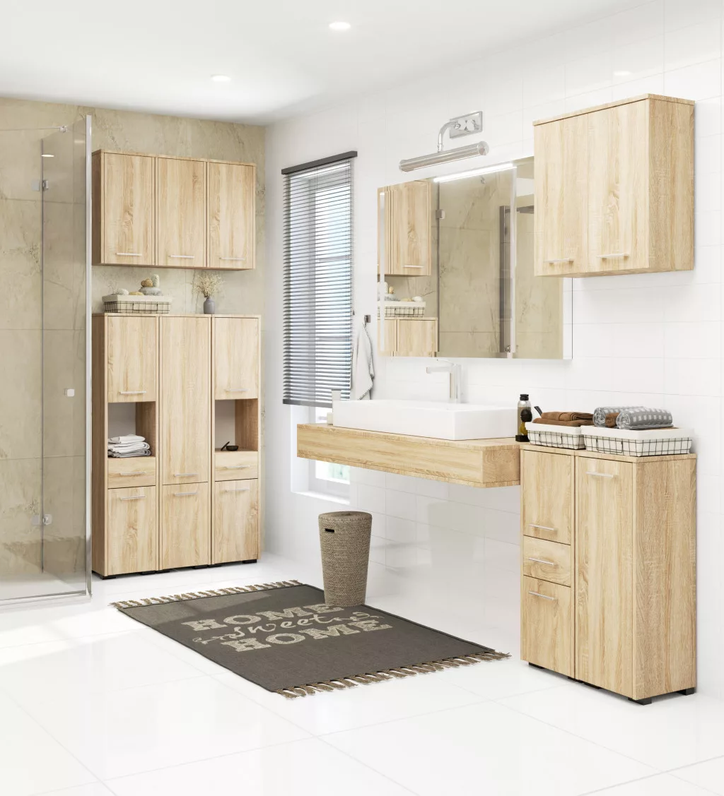 Ez a modern vonalvezetésű fürdőszobai fali szekrény tökéletes megoldást kínál a fürdőszobai kellékek rendszerezett tárolására. A 16 mm vastag, kiváló minőségű laminált bútorlapból készült szekrény nem csak strapabíró, de esztétikus megjelenésű is a Sonoma tölgy színben. Az ABS élzárás extra védelmet biztosít a nedvesség ellen.
