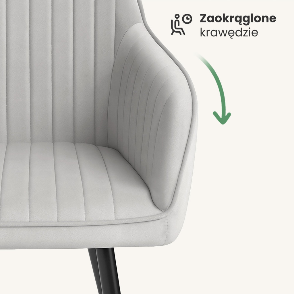 Elegáns bársony étkezőszék függőleges steppelt varrásokkal és fekete acél lábakkal, amely modern stílust és kényelmet kölcsönöz étkezőjének vagy nappalijának.