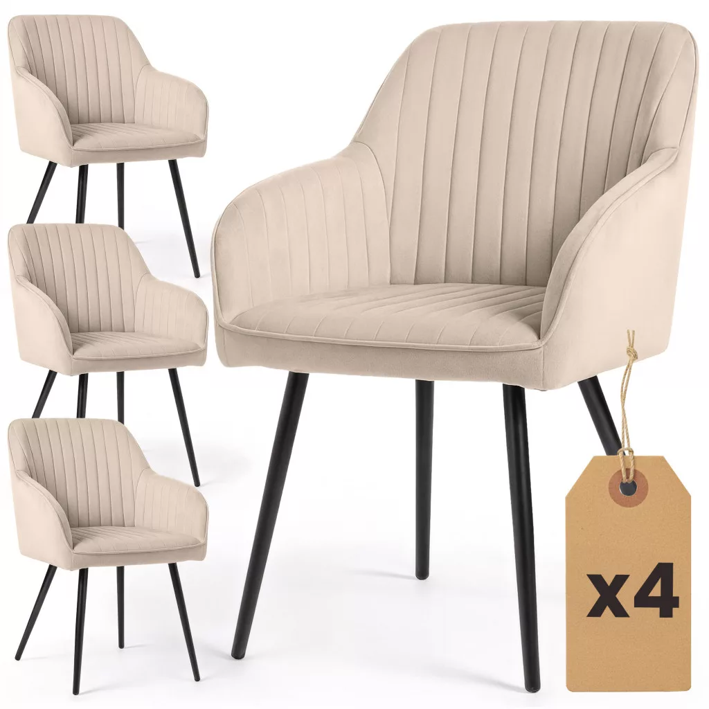 Elegancki zestaw 4 welurowych krzeseł Florence w beżowym kolorze z pionowymi przeszyciami i czarnymi stalowymi nogami. Idealne do nowoczesnych jadalni i salonów w stylu glamour.