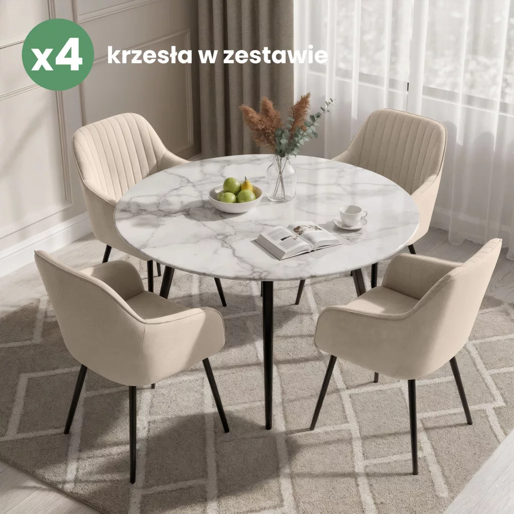 Krzesło welurowe Florence to połączenie wyrafinowanego designu z funkcjonalnością. Miękka tapicerka z weluru w ciepłym beżowym odcieniu ozdobiona pionowymi przeszyciami nadaje mu wyjątkowy charakter, a czarne stalowe nogi podkreślają nowoczesną elegancję. Ergonomiczne oparcie i wygodne siedzisko zapewniają komfort podczas długich posiłków czy spotkań. Zestaw 4 krzeseł idealnie komponuje się z różnymi stylami wnętrz - od soft modern po glamour.