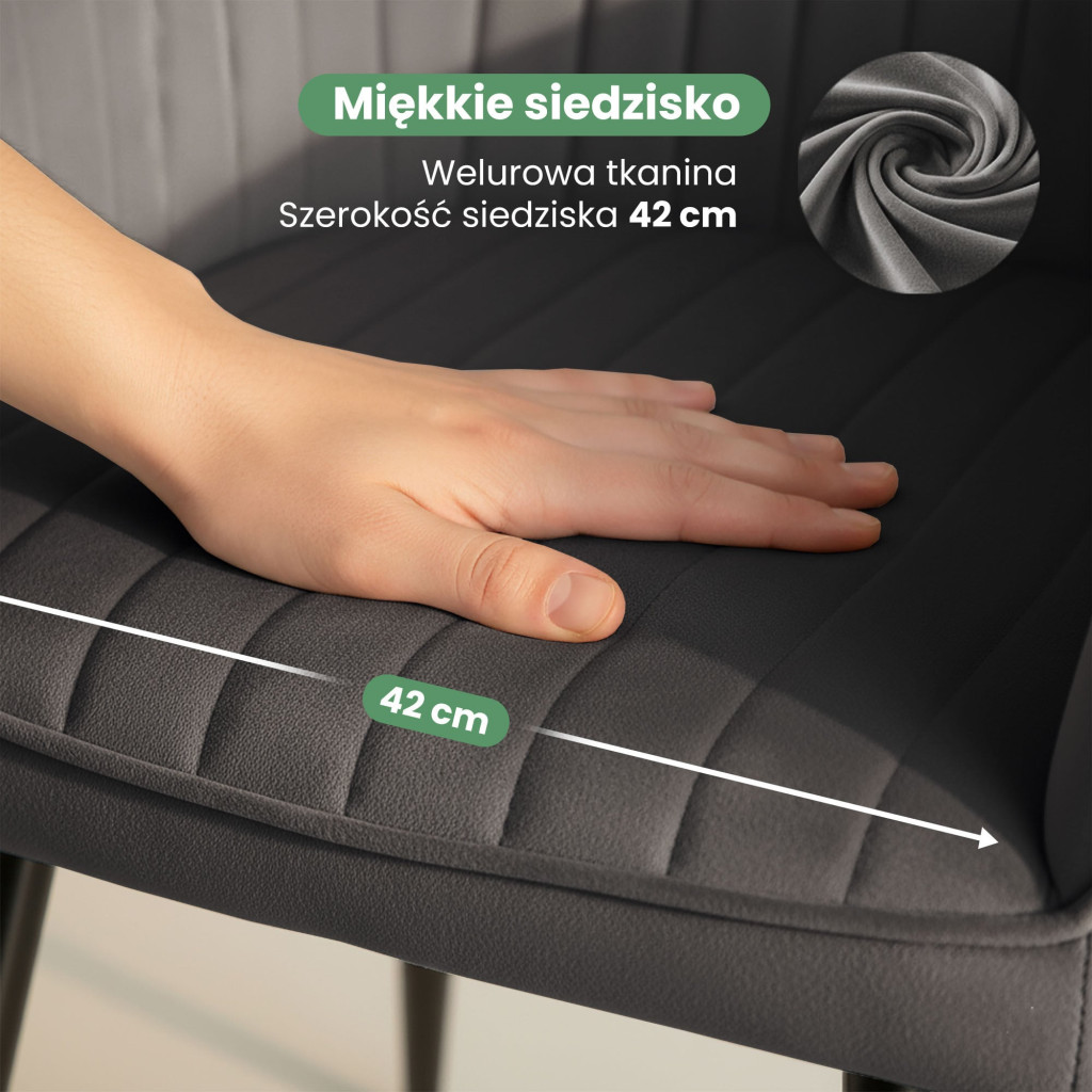 A Florence bársony szék a modern lakberendezés igazi ékköve, amely tökéletesen ötvözi az elegáns megjelenést a mindennapi kényelemmel. A függőleges varrások különleges textúrát adnak a prémium minőségű welúr kárpitnak, míg a sötét grafit szín kifinomult atmoszférát teremt bármely térben. A fekete acél lábak stabil alapot biztosítanak és harmonizálnak a modern design vonalaival.
