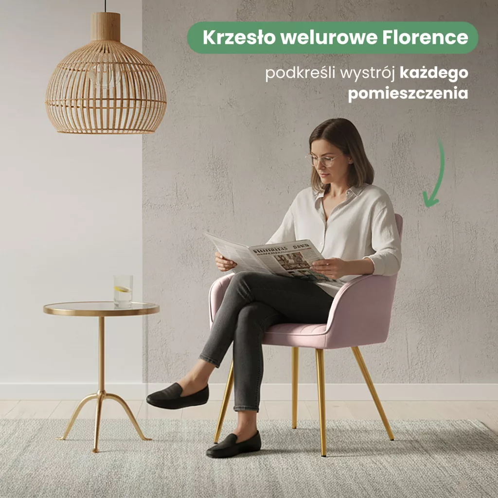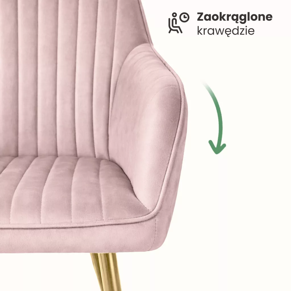 A Florence welur szék a modern elegancia és a kényelem tökéletes ötvözete. A függőleges varrások kifinomult megjelenést kölcsönöznek a széknek, míg a puder rózsaszín welur kárpit lágy tapintása és fényes felülete luxus hangulatot teremt. Az arany színű acél lábak glamour stílusjegyet adnak, amely különösen jól harmonizál a modern és soft modern berendezési stílusokkal. A szék ergonomikus kialakítása 48 cm-es ülésmagassággal és 120 kg teherbírással biztosítja a hosszú távú kényelmet.