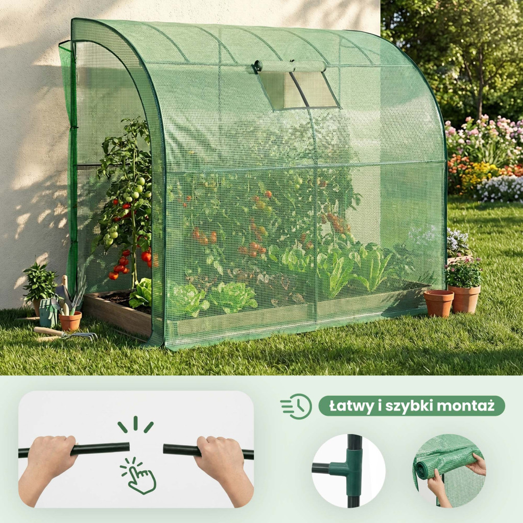 A rolós ajtó és az ablak könnyű hozzáférést és hatékony szellőzést tesz lehetővé, így szabályozhatod a belső hőmérsékletet és páratartalmat. Az UV szűrős fólia megvédi a növényeket a káros sugárzástól, elősegítve a csírázást, növekedést és érést. A 2 m² alapterület elegendő helyet biztosít paradicsom, paprika, saláta és egyéb zöldségek, gyümölcsök vagy dísznövények termesztéséhez. Egyszerű összeszerelés, talajba rögzíthető horgonyokkal.