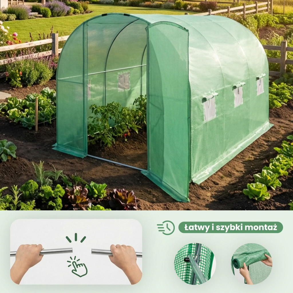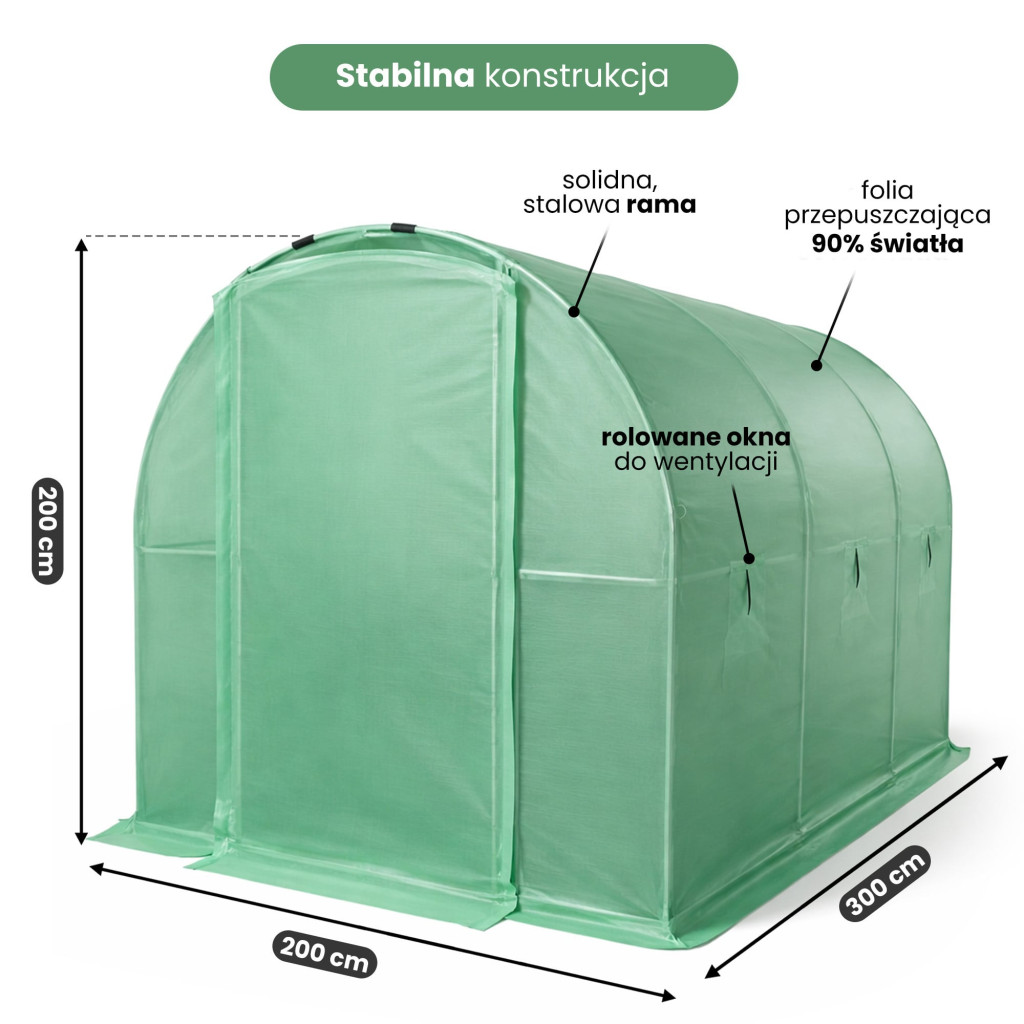 A fóliasátor ideális mikroklímát teremt a magok csírázásához, a palánták fejlődéséhez és a zöldségek, gyümölcsök érleléséhez. A zöld fólia optimális fényáteresztést biztosít, miközben védi a növényeket a káros UV-sugárzástól. A talajra kotorékokkal rögzíthető konstrukció egyszerűen összeszerelhető, és hosszú éveken át megbízható szolgálatot nyújt. Tökéletes választás azok számára, akik egészséges, saját termesztésű zöldségeket szeretnének élvezni.