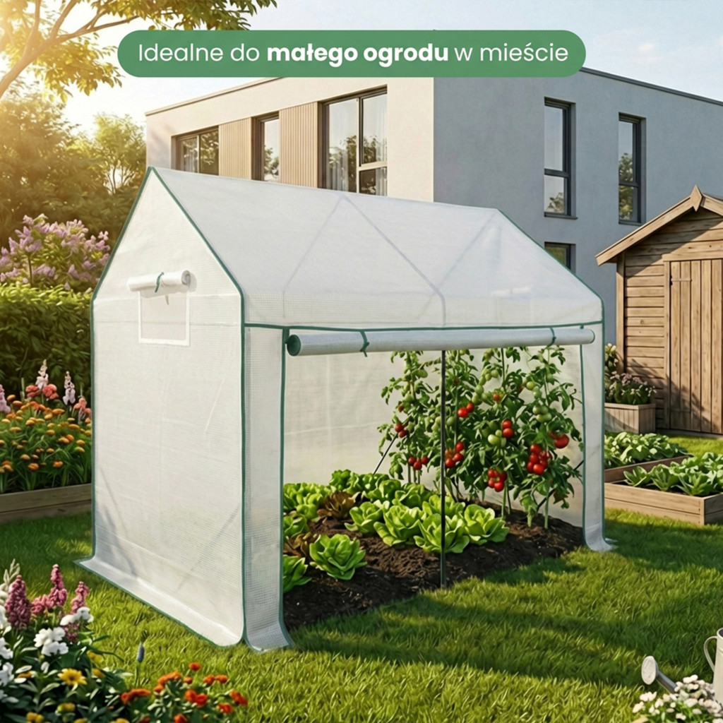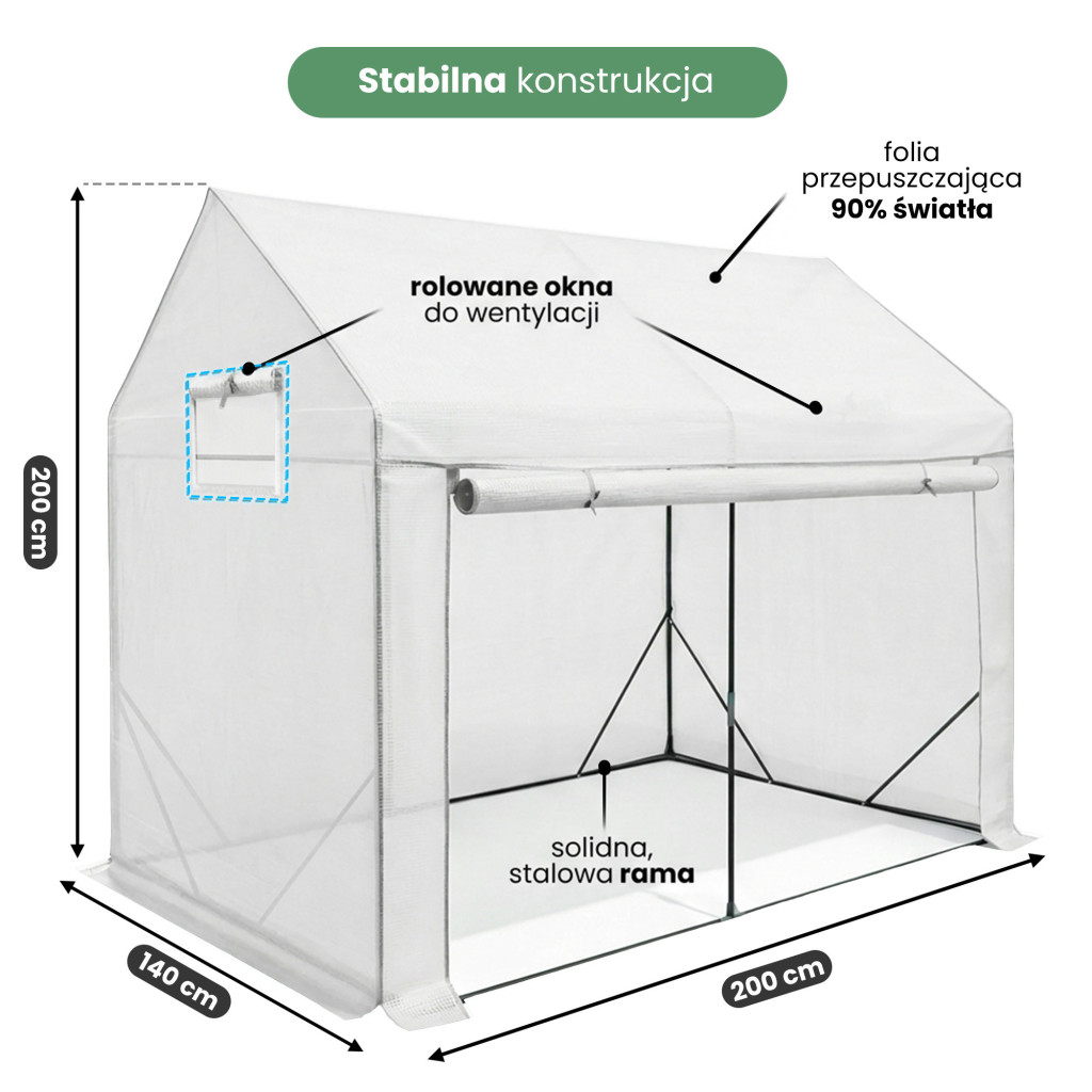 Ez a praktikus kerti fóliaüvegház tökéletes választás azok számára, akik kis helyen szeretnék meghosszabbítani a termesztési szezont és optimális körülményeket biztosítani növényeiknek. A 200x140 cm-es alapterület ideális városi kertekhez vagy kisebb teraszokhoz, miközben a 2 méteres belmagasság kényelmes munkavégzést tesz lehetővé. A fehér porszórt acél váz stabil szerkezetet biztosít, míg az UV szűrős PE fólia védelmet nyújt a káros napsugárzás ellen.