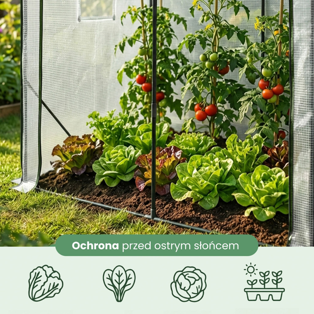 A roló típusú bejárati ajtó és a két oldalsó ablak kiváló szellőzést garantál, így könnyen szabályozható a belső hőmérséklet és páratartalom. A fóliaüvegház megvédi növényeit a széltől, hidegtől és túlzott csapadéktól, miközben elegendő fényt enged át az egészséges növekedéshez. A talajra rögzíthető konstrukció stabil alapot biztosít, és egyszerűen összeszerelhető. Tökéletes választás zöldségek, gyümölcsök és dísznövények termesztéséhez.