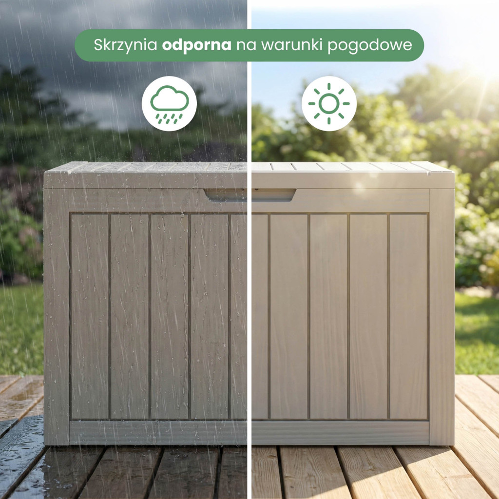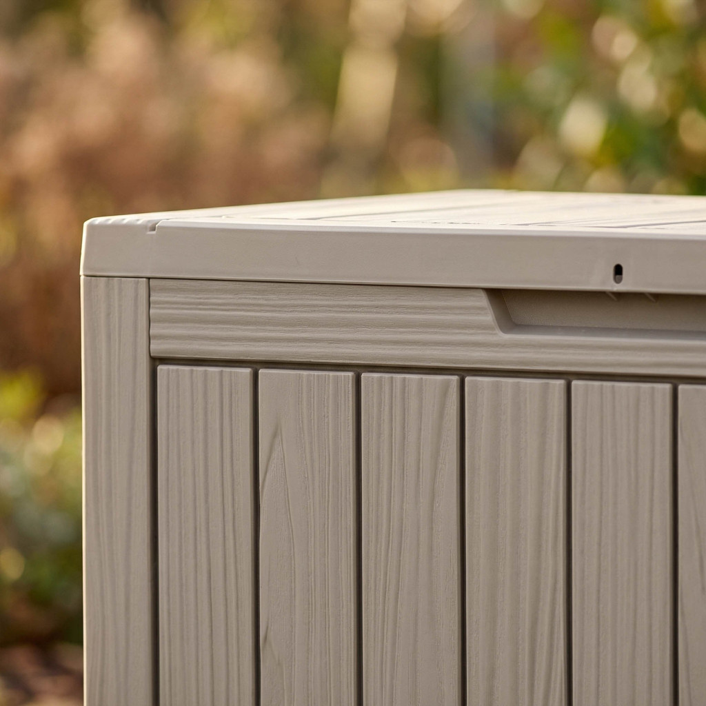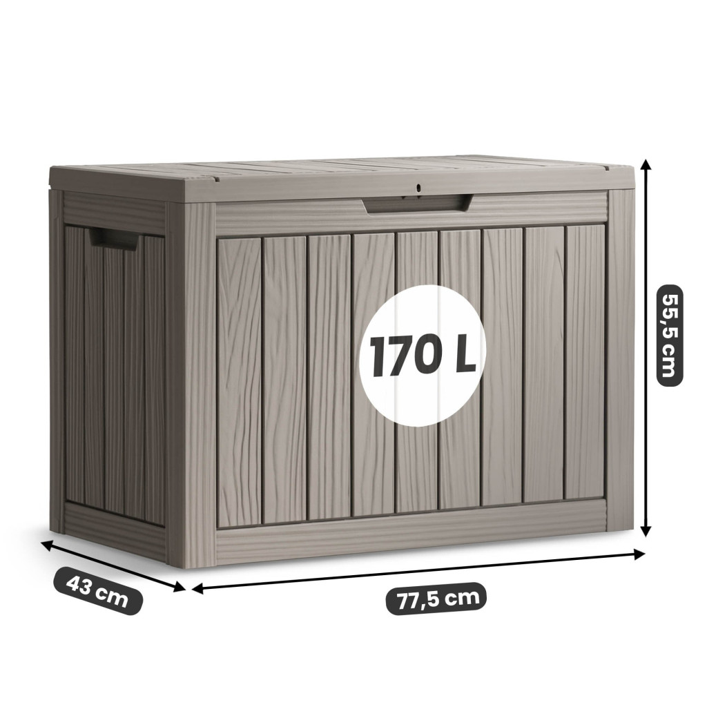 Ez a 170 literes kerti tároló láda kiváló választás mindazok számára, akik rendezett és esztétikus külső teret szeretnének. A láda elegendő helyet biztosít kerti párnák, játékok, szerszámok és egyéb kiegészítők tárolására. A fa-textúrát imitáló felület természetes és elegáns megjelenést kölcsönöz, amely harmonikusan illeszkedik bármilyen kerti környezetbe. A vízálló kialakítás és az UV-szűrő védi a tárolt tárgyakat a nedvességtől és a napsugárzástól.