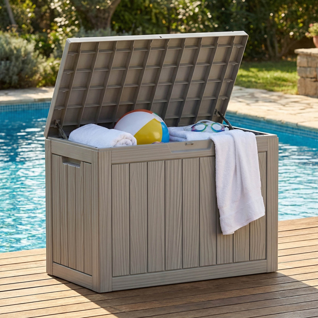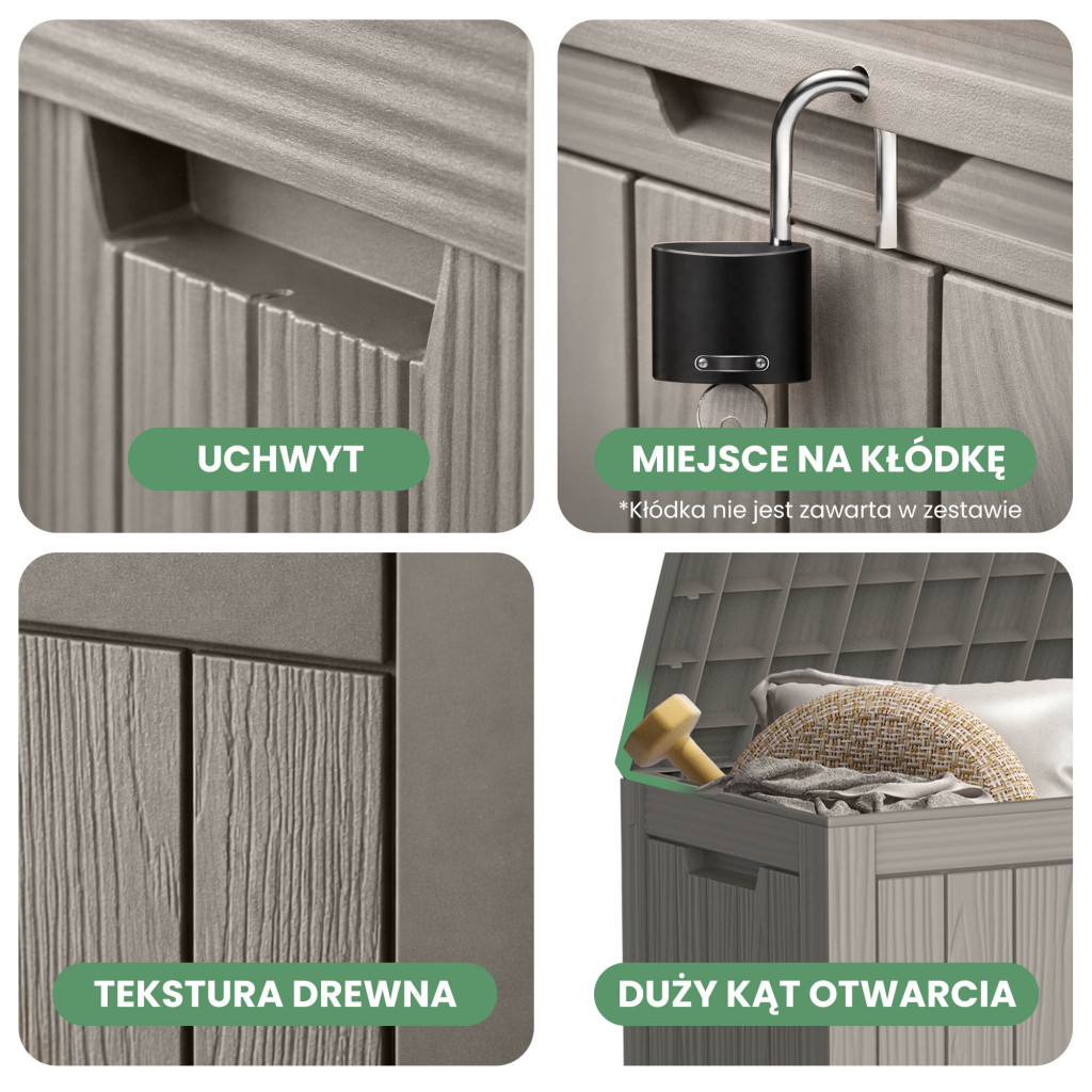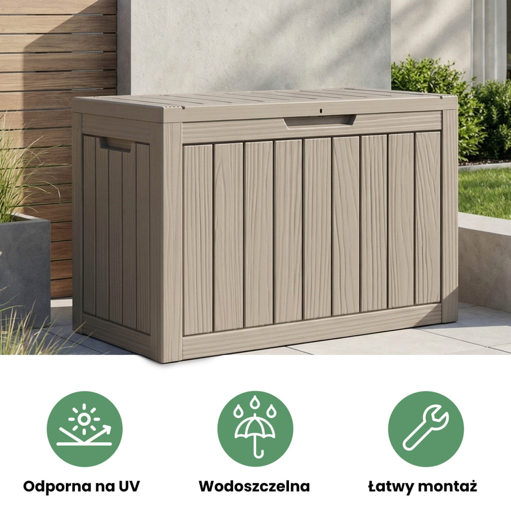 Ez a 170 literes kerti tároló láda kiváló választás mindazok számára, akik rendezett és esztétikus külső teret szeretnének. A láda elegendő helyet biztosít kerti párnák, játékok, szerszámok és egyéb kiegészítők tárolására. A fa-textúrát imitáló felület természetes és elegáns megjelenést kölcsönöz, amely harmonikusan illeszkedik bármilyen kerti környezetbe. A vízálló kialakítás és az UV-szűrő védi a tárolt tárgyakat a nedvességtől és a napsugárzástól.