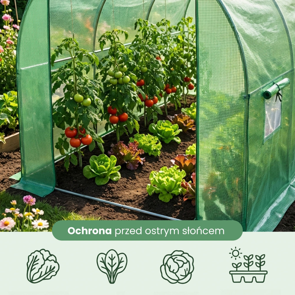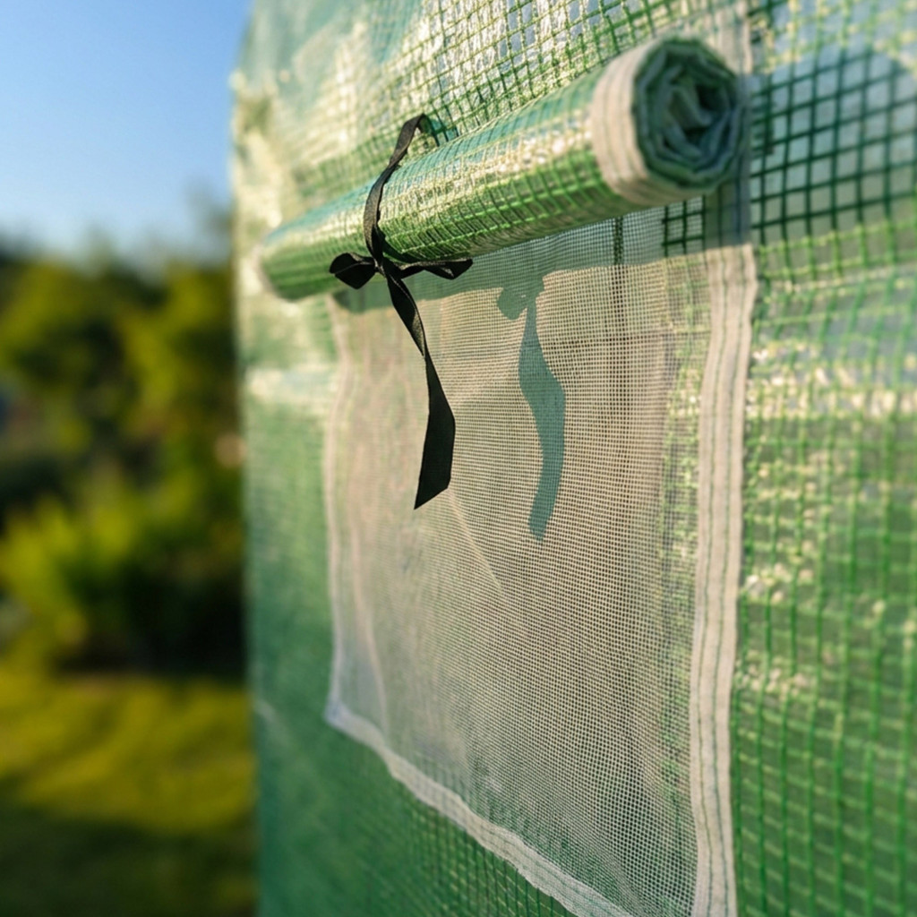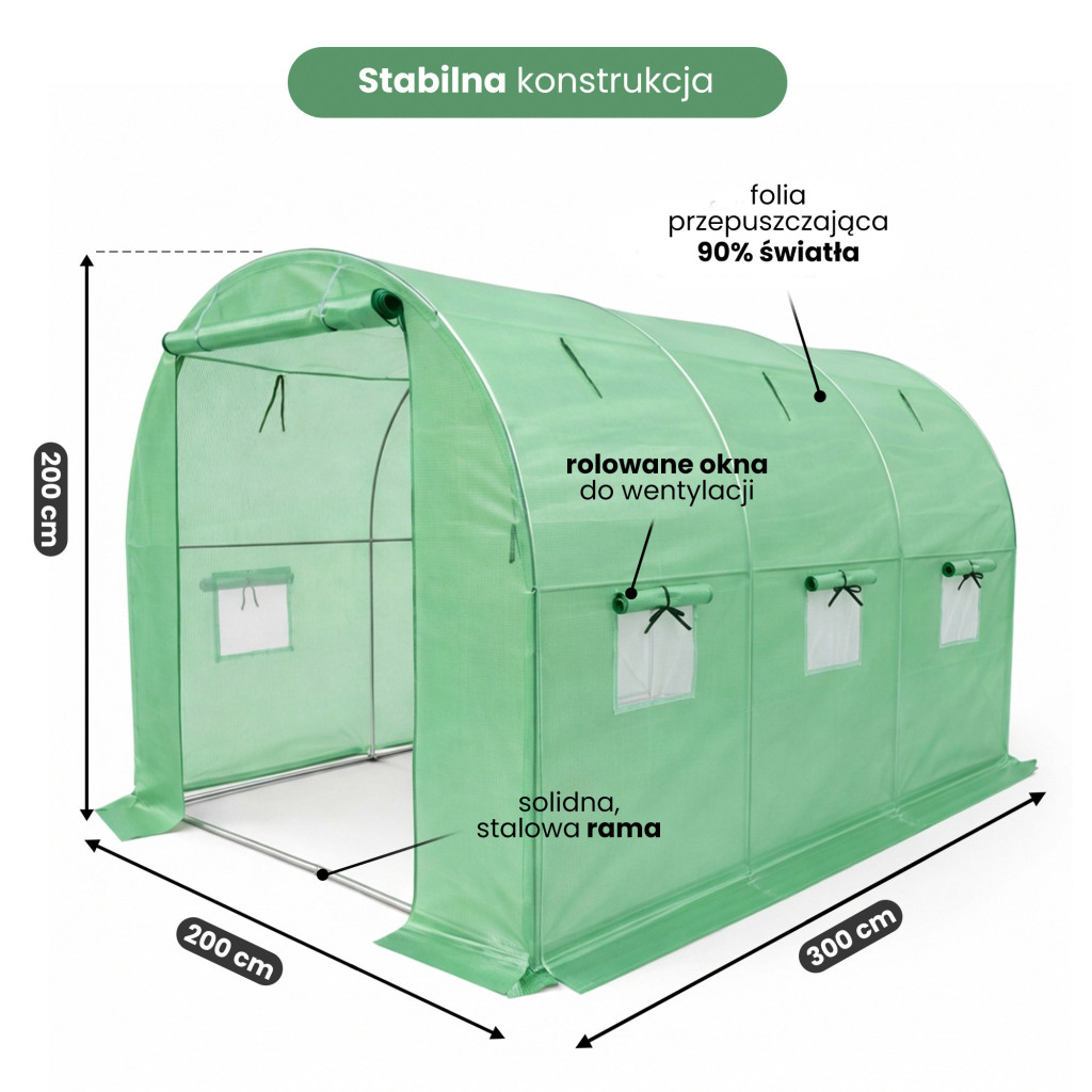 Ez a 200x300x200 cm-es alagút típusú fóliaház tökéletes megoldás a hobbikertészek és a komoly termesztők számára egyaránt. A galvanizált acélvázas szerkezet kiváló stabilitást és korrózióállóságot biztosít, míg a zöld PE fólia UV-szűrővel védi növényeit a káros sugárzástól. A 6 felgöngyölhető ablak rovarháló-betéttel van ellátva, amely lehetővé teszi az optimális szellőzést anélkül, hogy káros rovarok jutnának be.