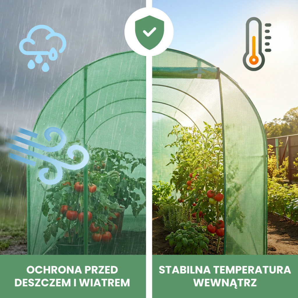 A 3 szekciós szerkezet 6 m² termesztési területet kínál, ideális zöldségek, gyümölcsök és dísznövények számára. A rolós ajtó és oldalfalak könnyű hozzáférést biztosítanak, a földbe rögzíthető kivitel pedig stabil telepítést garantál. A fóliaház megvédi növényeit a széltől, hidegtől és túlzott csapadéktól, miközben átengedi a megfelelő mennyiségű fényt a fotoszintézishez.