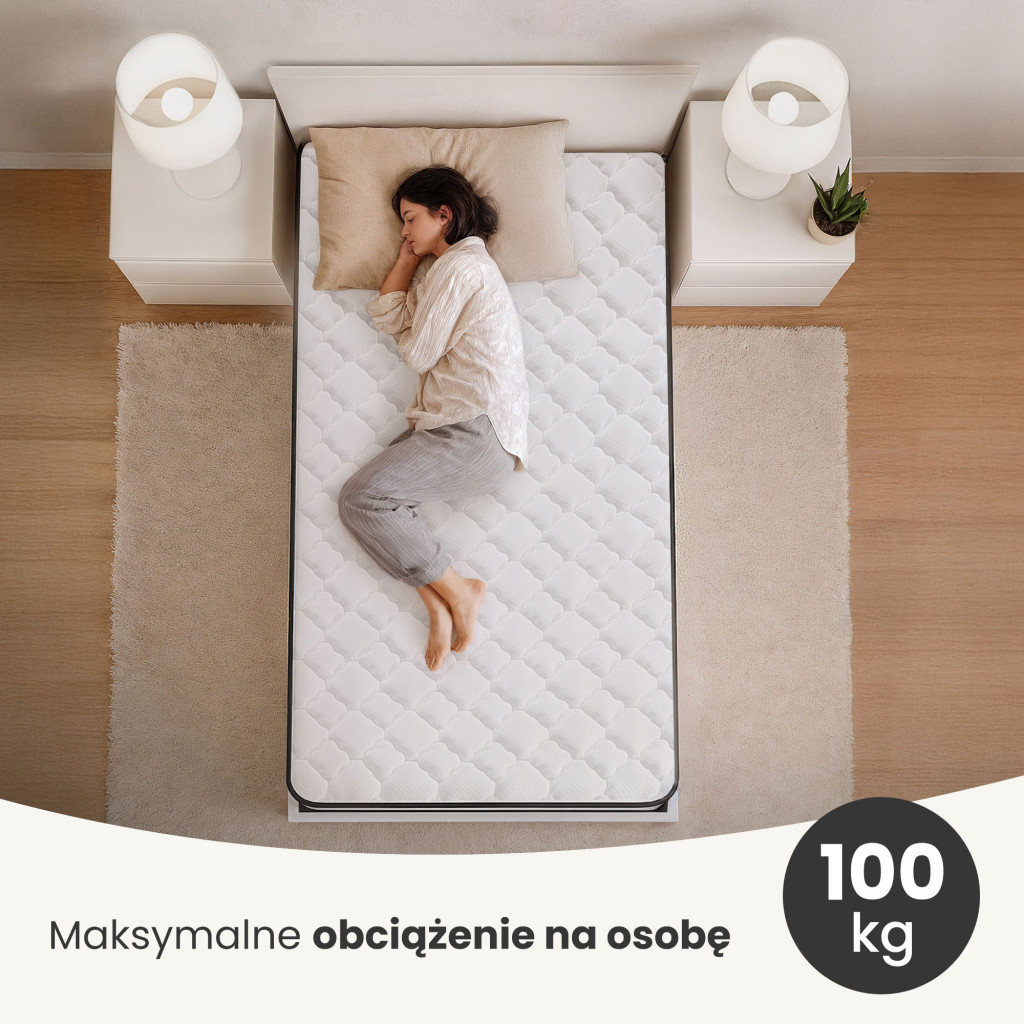 A matrac fehér védőhuzattal érkezik, amely megóvja a belső szerkezetet és könnyen tisztítható. A H3 közepes keménység ideális választás 100 kg-ig terhelhetőséghez, tökéletes egyensúlyt teremtve a kényelem és a megfelelő támasztás között. A minőségi kivitelezés és a gondosan megválasztott anyagok hosszú élettartamot és kiváló alvási élményt garantálnak éjszakáról éjszakára.