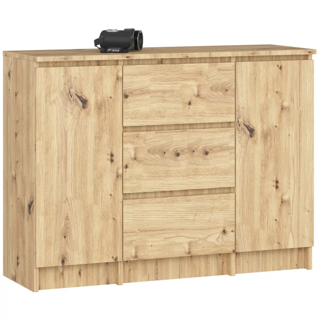 Modern vonalvezetésű, praktikus komód 2 ajtóval és 3 fiókkal, tartós laminált lapból készítve Artisan tölgy színben.
