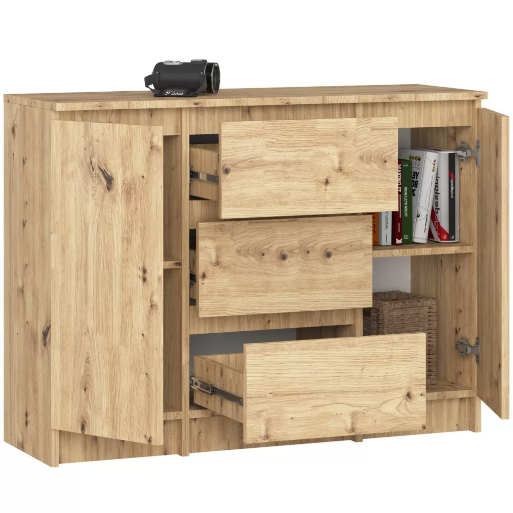 A komód két ajtós szekrényrésszel és három tágas fiókkal rendelkezik, amelyek fémgörgős síneken futnak a könnyű használat érdekében. Az ABS élzárással ellátott frontok és oldalak hosszú élettartamot és elegáns megjelenést biztosítanak.