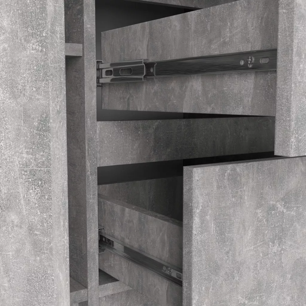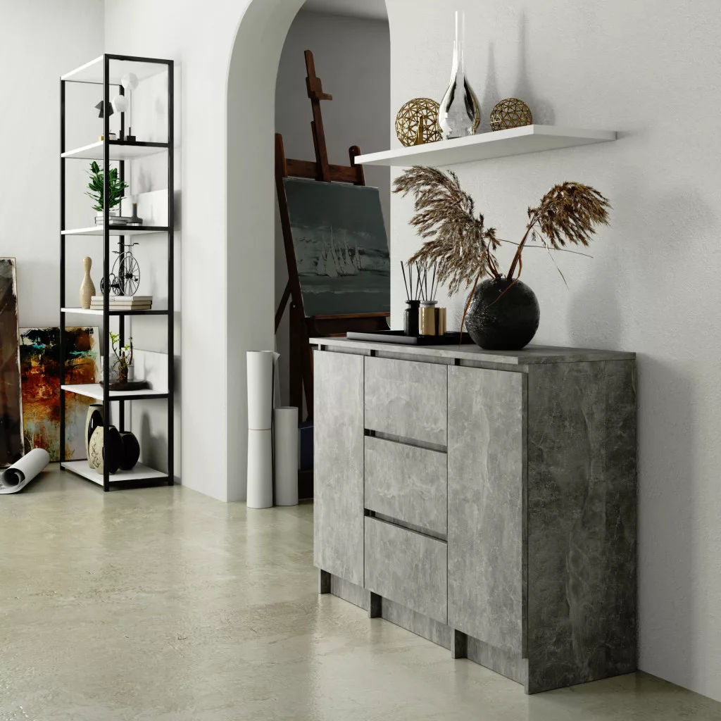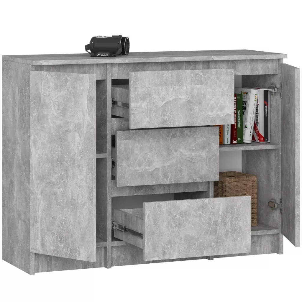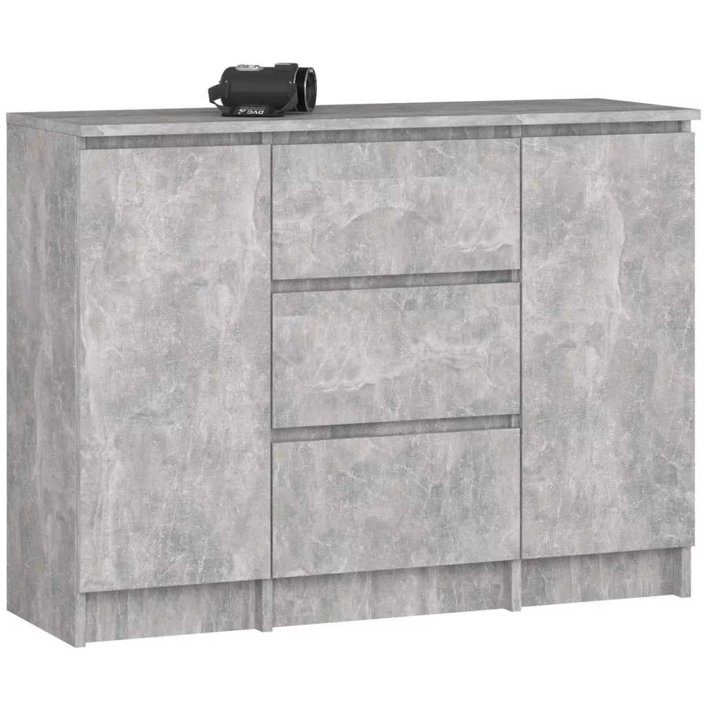 Modern, beton hatású komód 3 tágas fiókkal és 2 ajtóval, amely tökéletes tárolási megoldást kínál a nappaliba vagy hálószobába.