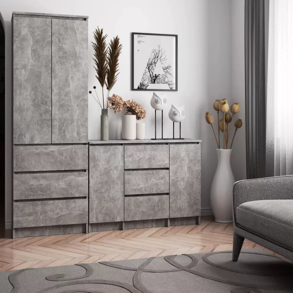 Ez a modern vonalvezetésű K100 komód egyesíti a funkcionalitást és az esztétikumot. A beton hatású felület különleges megjelenést kölcsönöz a bútornak, míg a 16 mm-es laminált lap tartósságot és kopásállóságot biztosít.