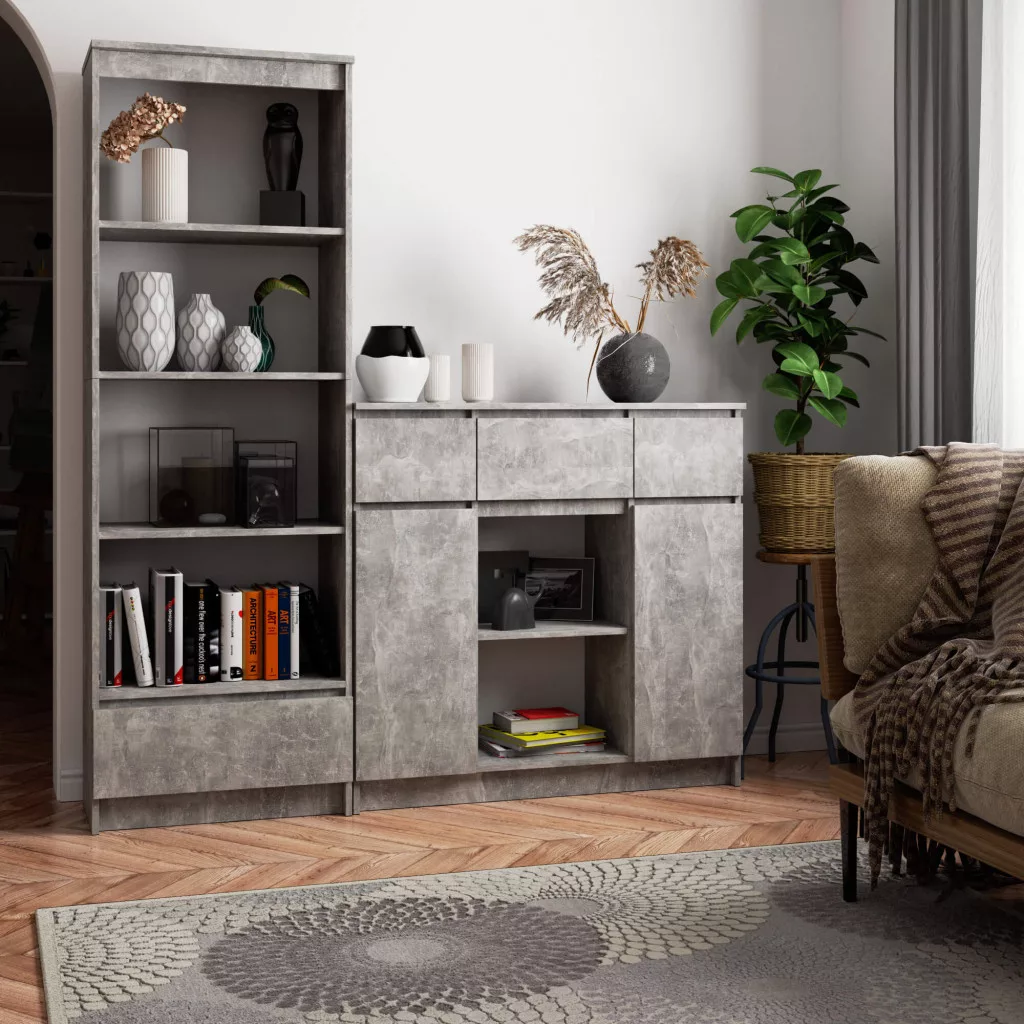 Modern, beton hatású komód 3 fiókkal és 2 ajtóval, amely tökéletes tárolási megoldást kínál a nappaliba vagy hálószobába. Strapabíró laminált bútorlapból készült, ABS élzárással.